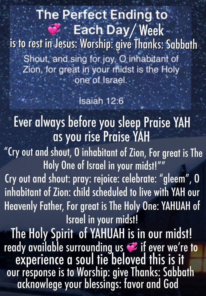 Happy Sabbath Father YAH please feed us, bless us, guide us today in all we do may we glorify You In Jesus Christ Name YAHUSHA Ha’MASSIACH Thank You for sparing our lives, mercies, grace, deliverance power, knowledge, wisdom, forgiveness, family may Your Word be The Bond that ties us together and to You In Jesus Name. Amen
