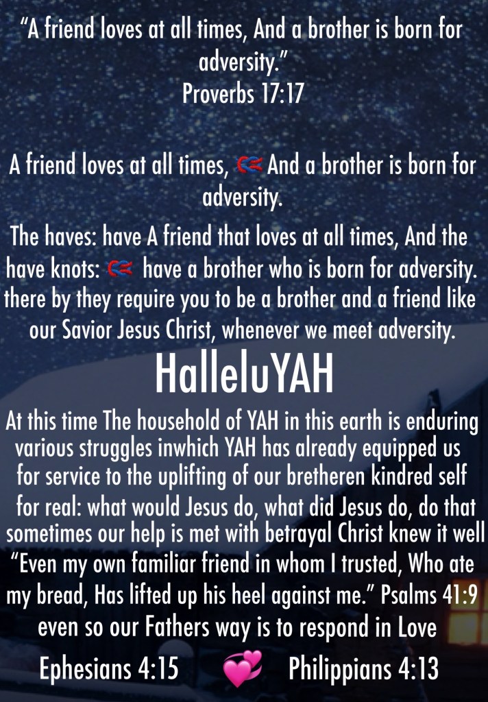 Pro 17:17 A friend loveth at all times, and a brother is born for adversity.
