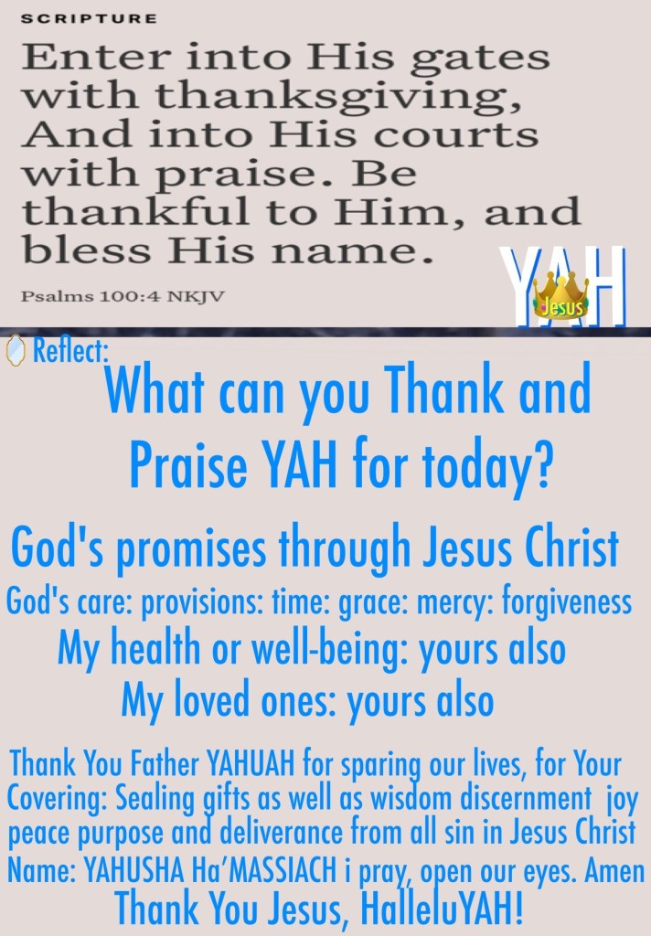 Psa 100:4 Enter into his gates with thanksgiving, and into his courts with praise: be thankful unto him, and bless his name.