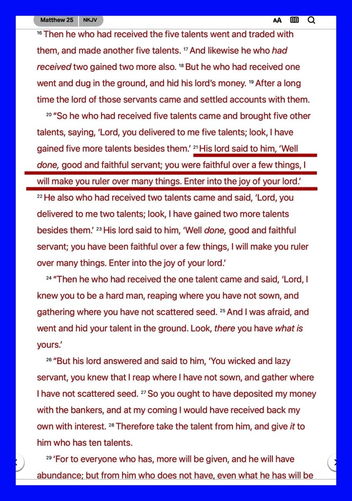 Mat 25:21 His lord said unto him, Well done, thou good and faithful servant: thou hast been faithful over a few things, I will make thee ruler over many things: enter thou into the joy of thy lord.