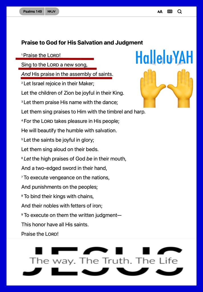 Psa 149:1 Praise ye the LORD. Sing unto the LORD a new song, and his praise in the congregation of saints.