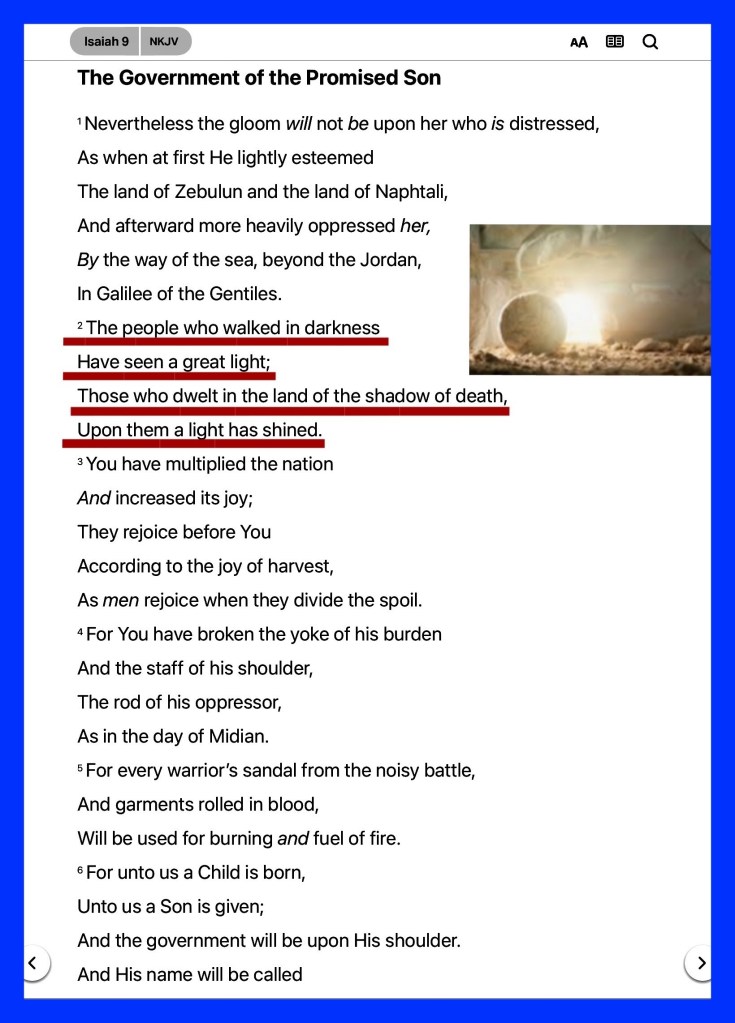 Isa 9:2 The people that walked in darkness have seen a great light: they that dwell in the land of the shadow of death, upon them hath the light shined.