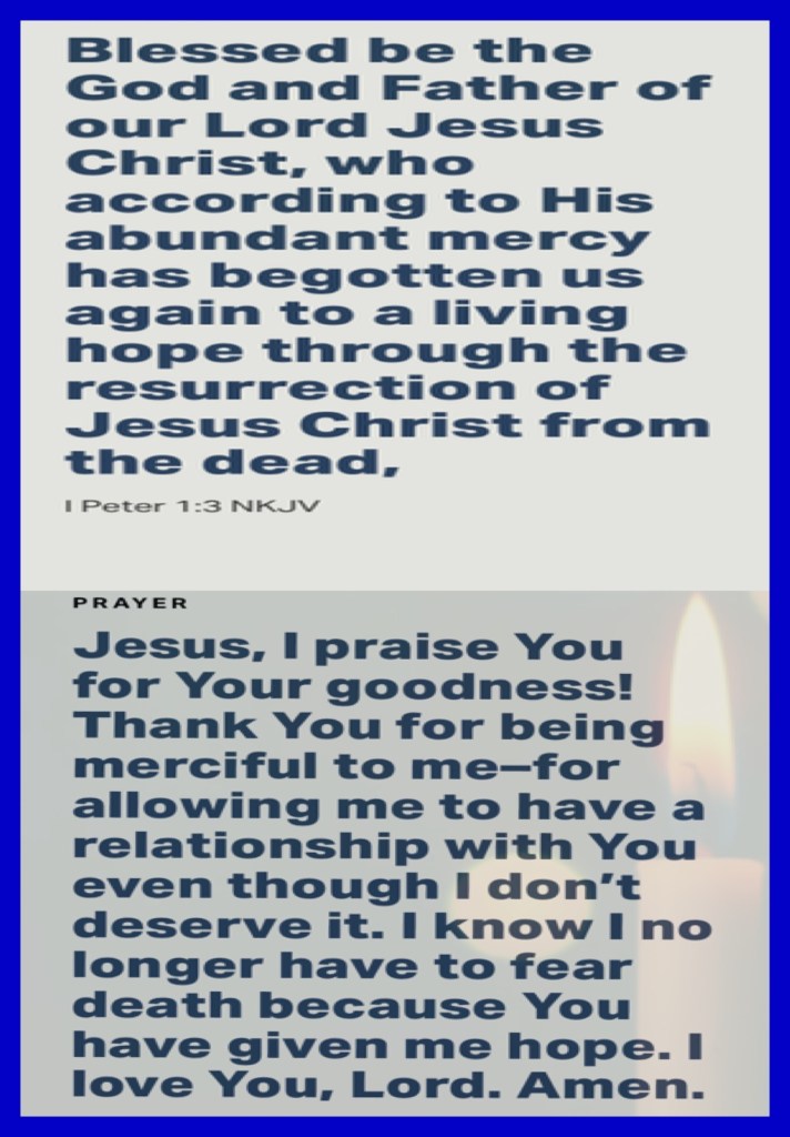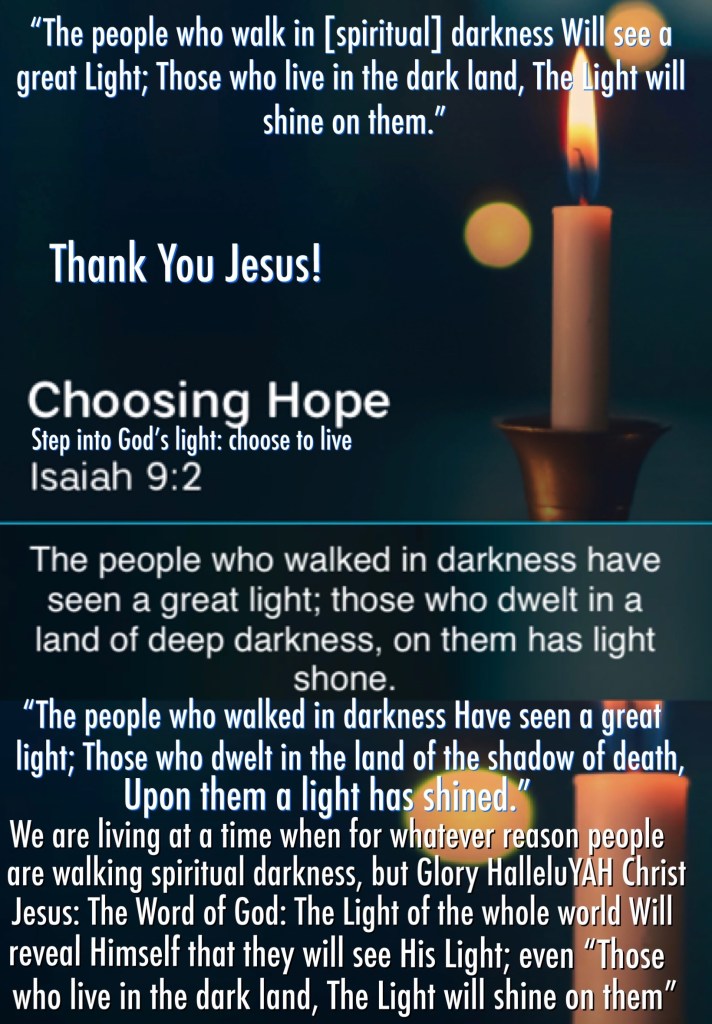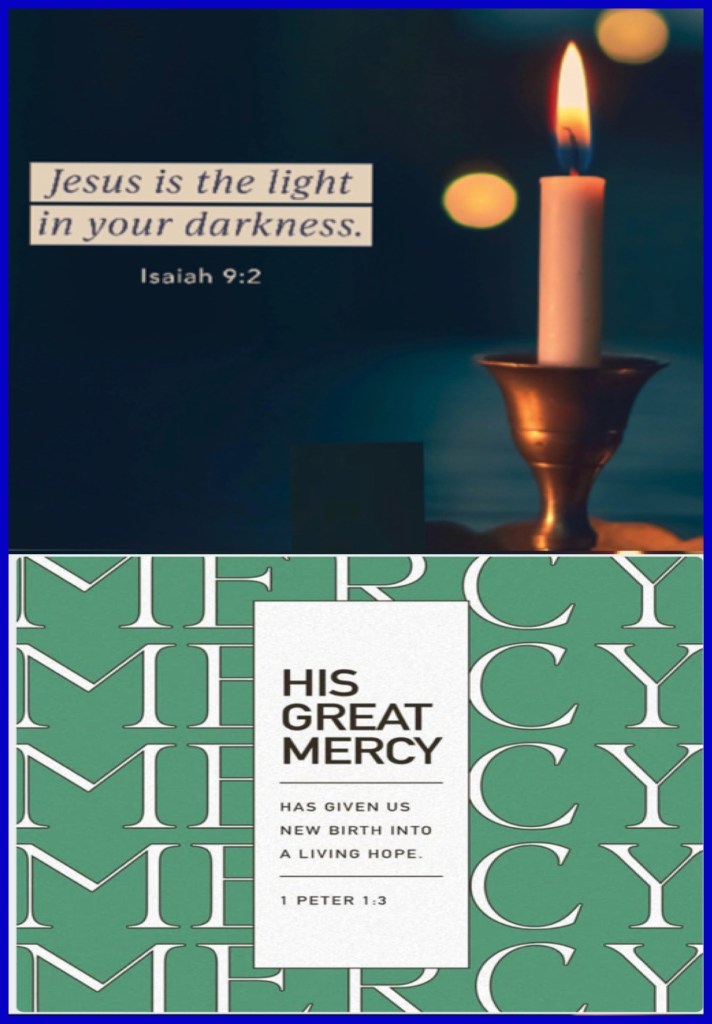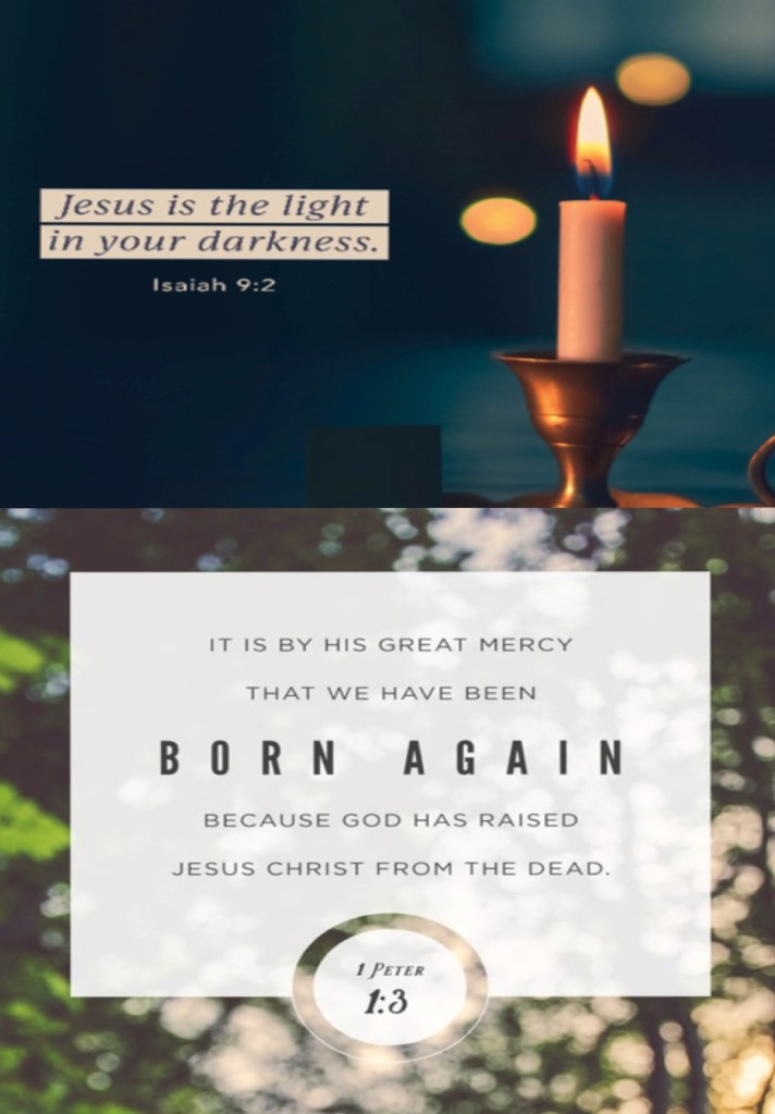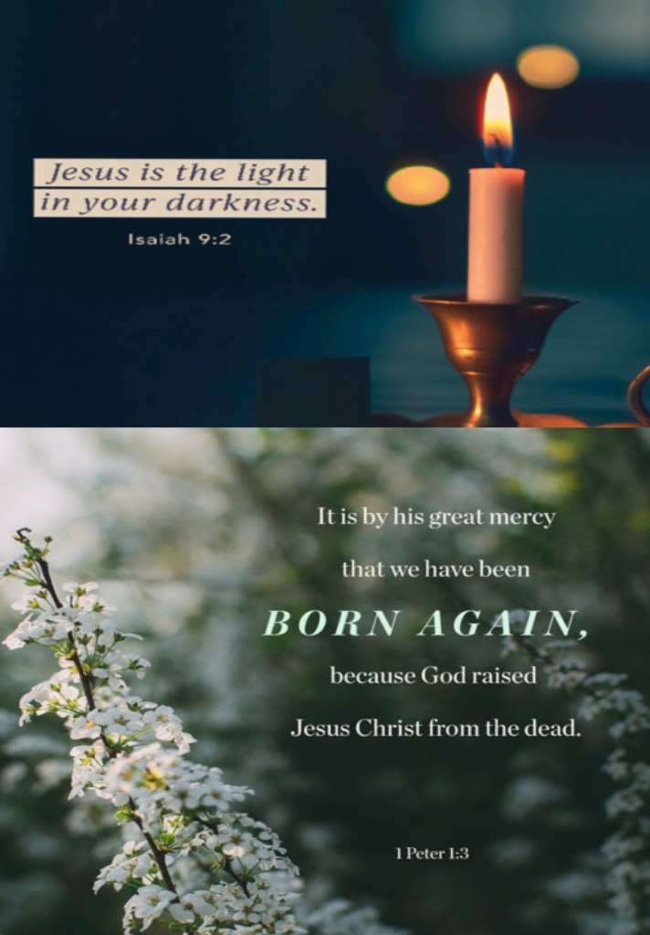 “The people who walked in darkness Have seen a great light; Those who dwelt in the land of the shadow of death, Upon them a light has shined.” Isaiah 9:2 “Blessed be the God and Father of our Lord Jesus Christ, who according to His abundant mercy has begotten us again to a living hope through the resurrection of Jesus Christ from the dead,” I Peter 1:3