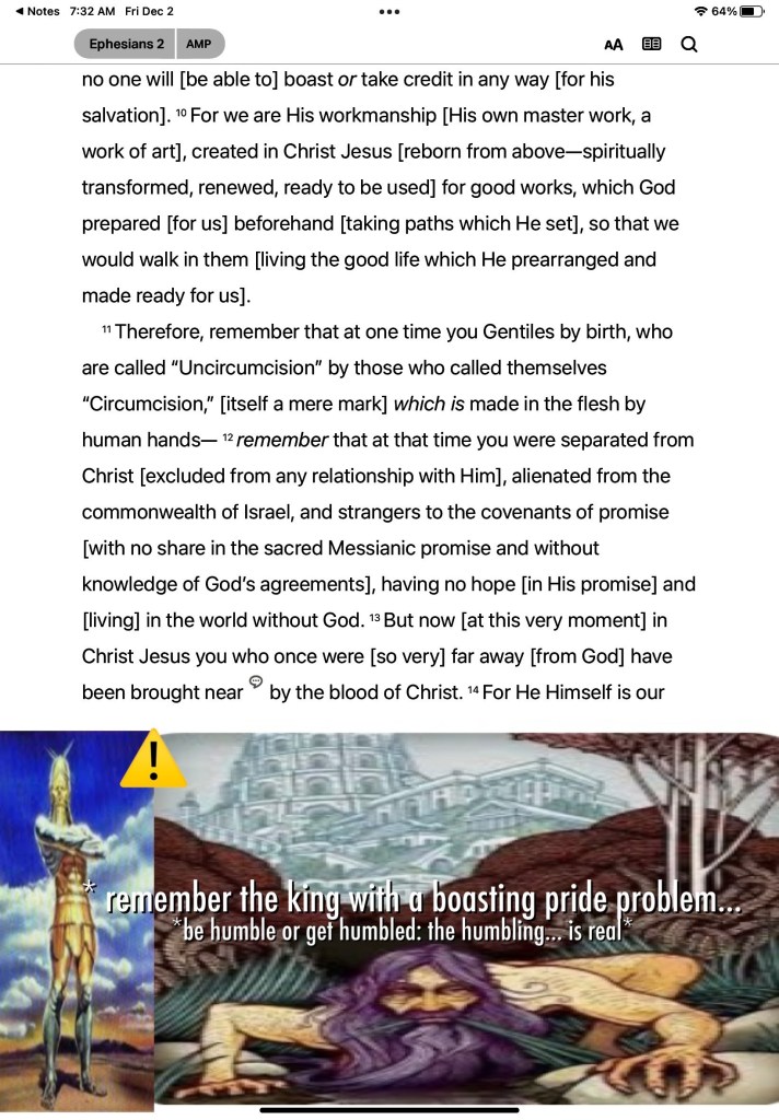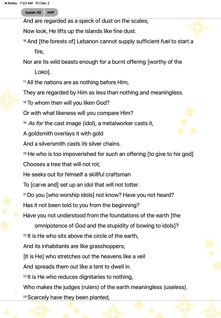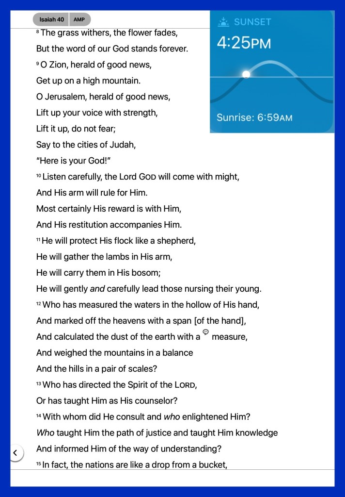 “The voice of one crying in the wilderness: “Prepare the way of The Lord; Make straight in the desert A highway for our God. Every valley shall be exalted And every mountain and hill brought low; The crooked places shall be made straight And the rough places smooth; The glory of The Lord shall be revealed, And all flesh shall see it together; For the mouth of The Lord has spoken.”” Isaiah 40:3-5 “For by grace you have been saved through faith, and that not of yourselves; it is the gift of God, not of works, lest anyone should boast.” Ephesians 2:8-9