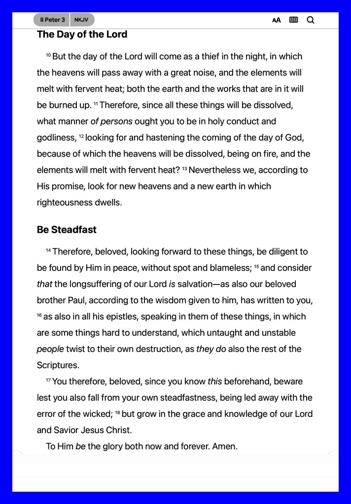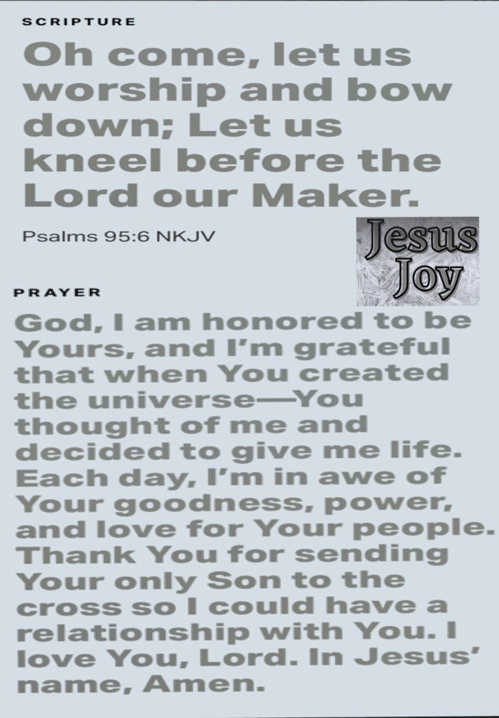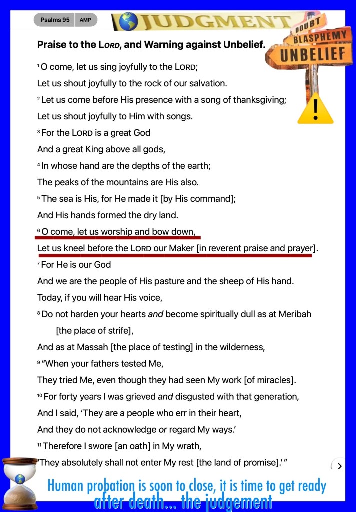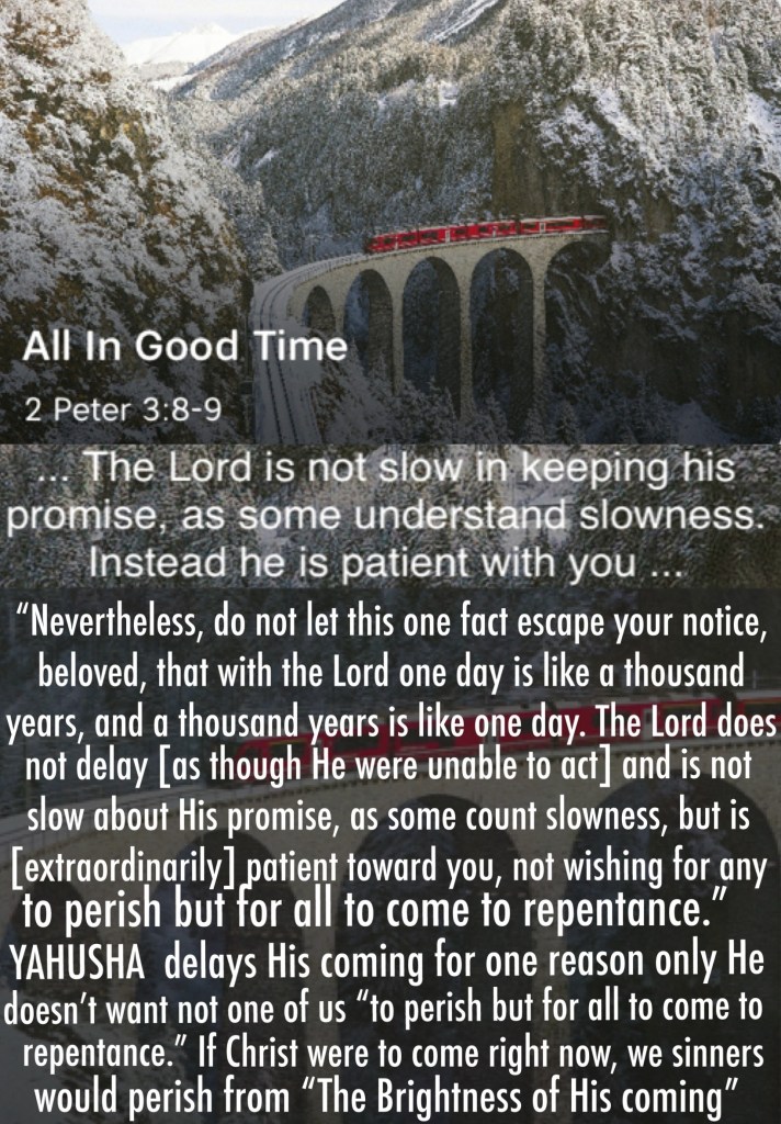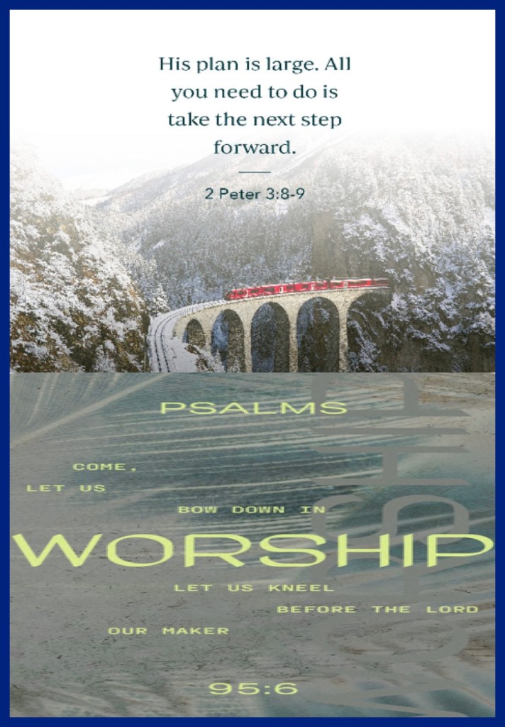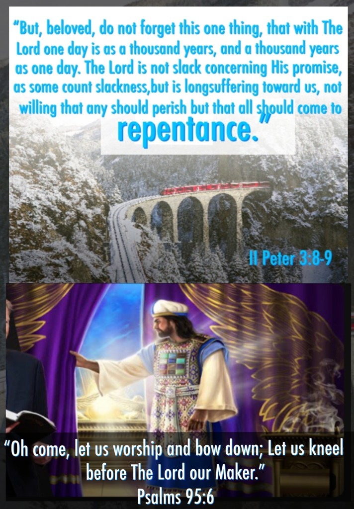 “But, beloved, do not forget this one thing, that with The Lord one day is as a thousand years, and a thousand years as one day. The Lord is not slack concerning His promise, as some count slackness, but is longsuffering toward us, not willing that any should perish but that all should come to repentance.” II Peter 3:8-9 “Oh come, let us worship and bow down; Let us kneel before The Lord our Maker.” Psalms 95:6