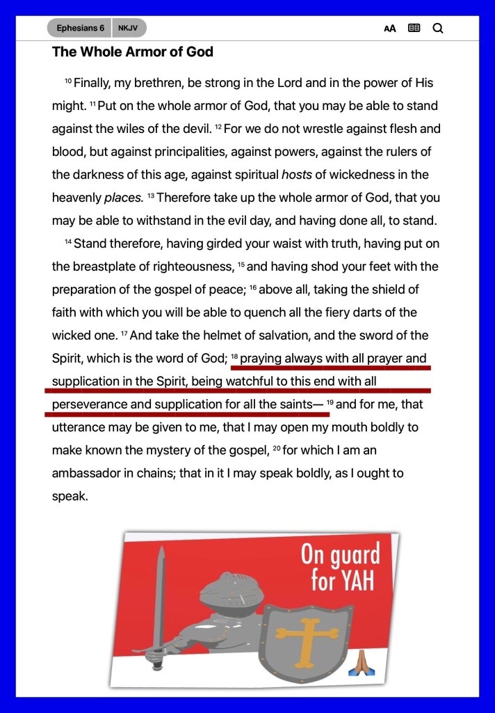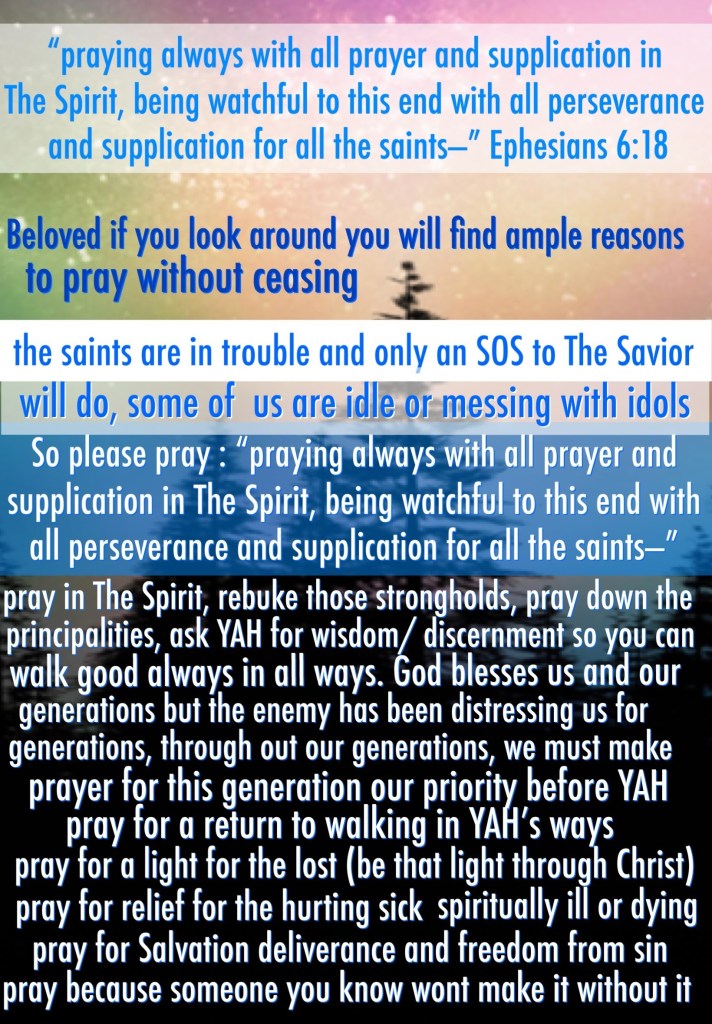 Eph 6:18 Praying always with all prayer and supplication in the Spirit, and watching thereunto with all perseverance and supplication for all saints;