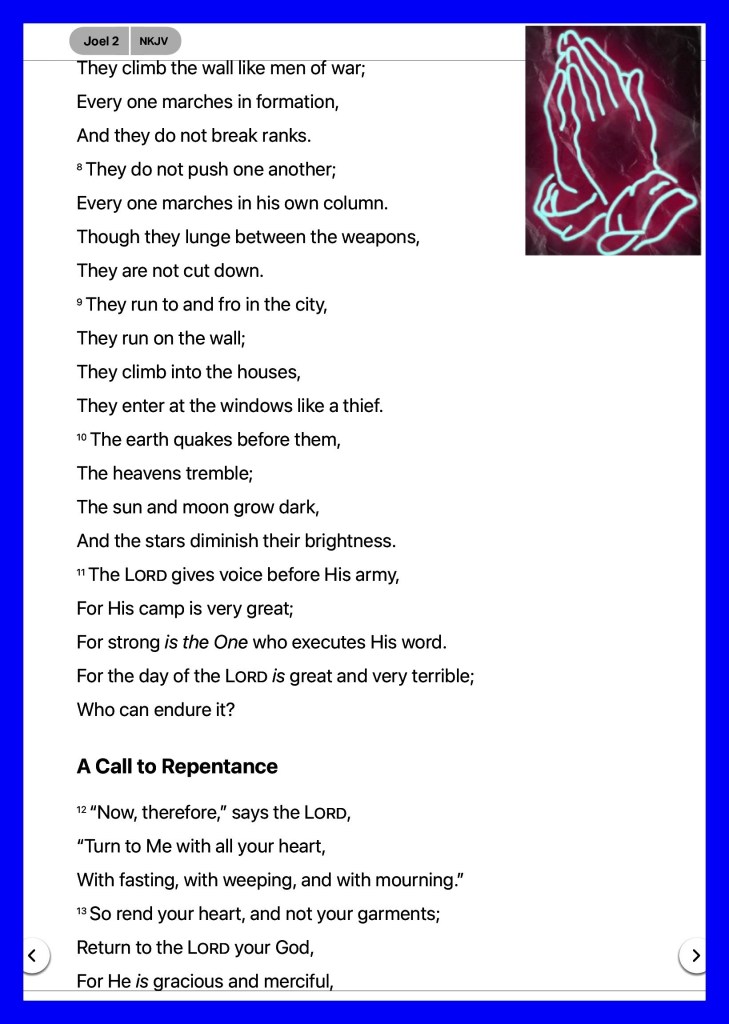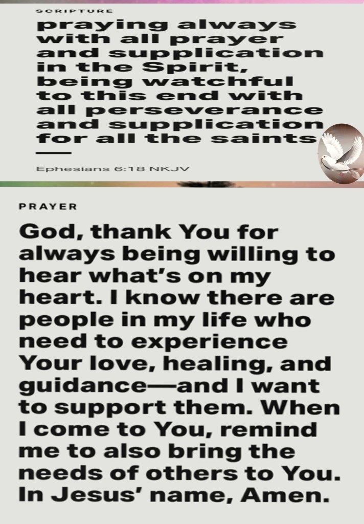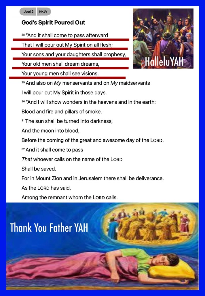 ““And it shall come to pass afterward That I will pour out My Spirit on all flesh; Your sons and your daughters shall prophesy, Your old men shall dream dreams, Your young men shall see visions.” Joel 2:28 “praying always with all prayer and supplication in The Spirit, being watchful to this end with all perseverance and supplication for all the saints—” Ephesians 6:18