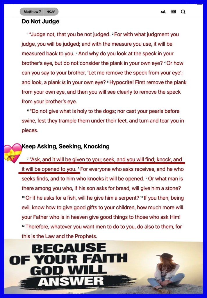 Mat 7:7 Ask, and it shall be given you; seek, and ye shall find; knock, and it shall be opened unto you:
