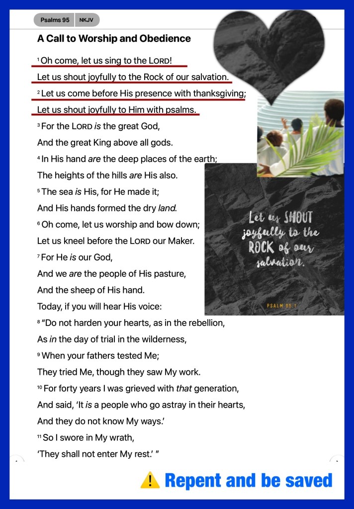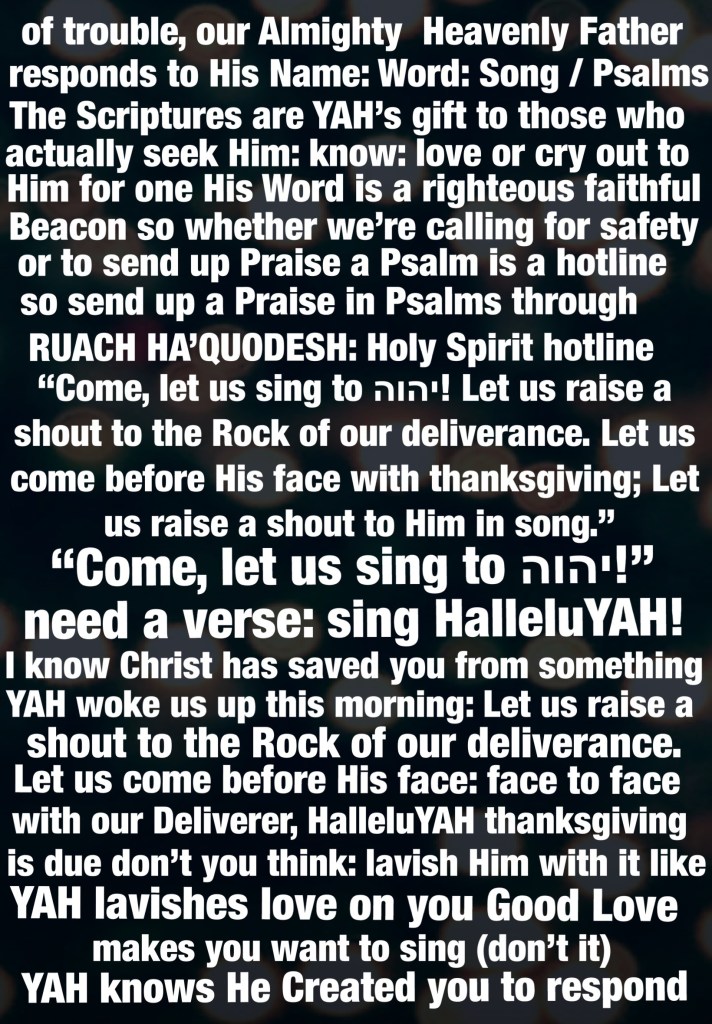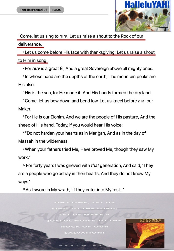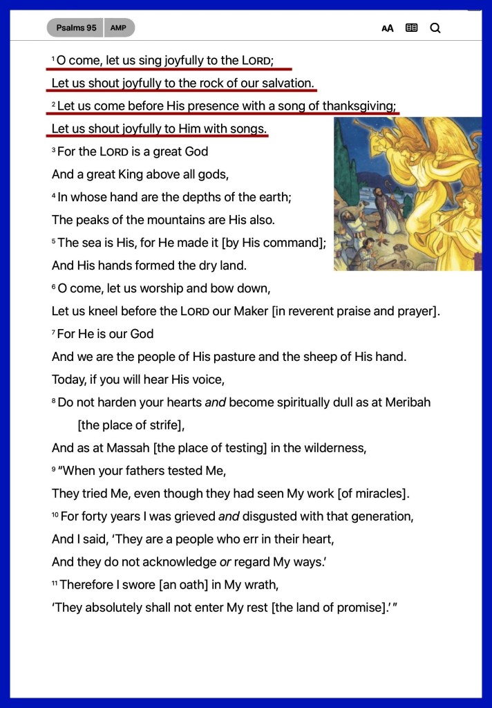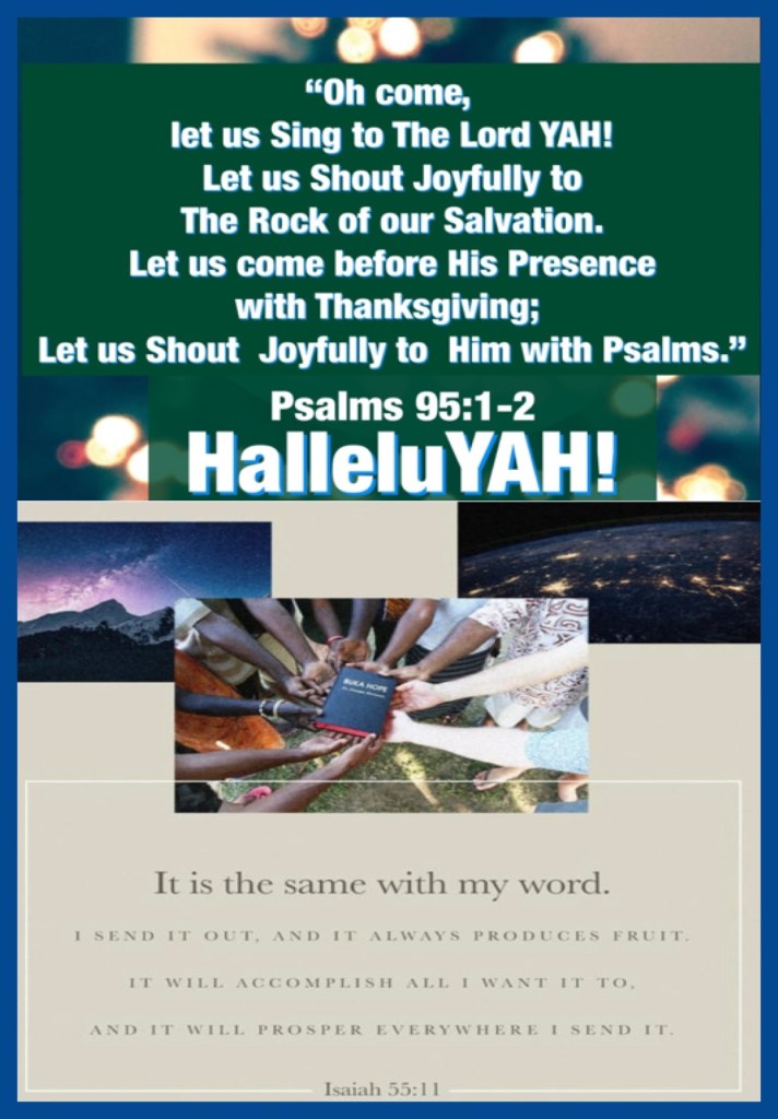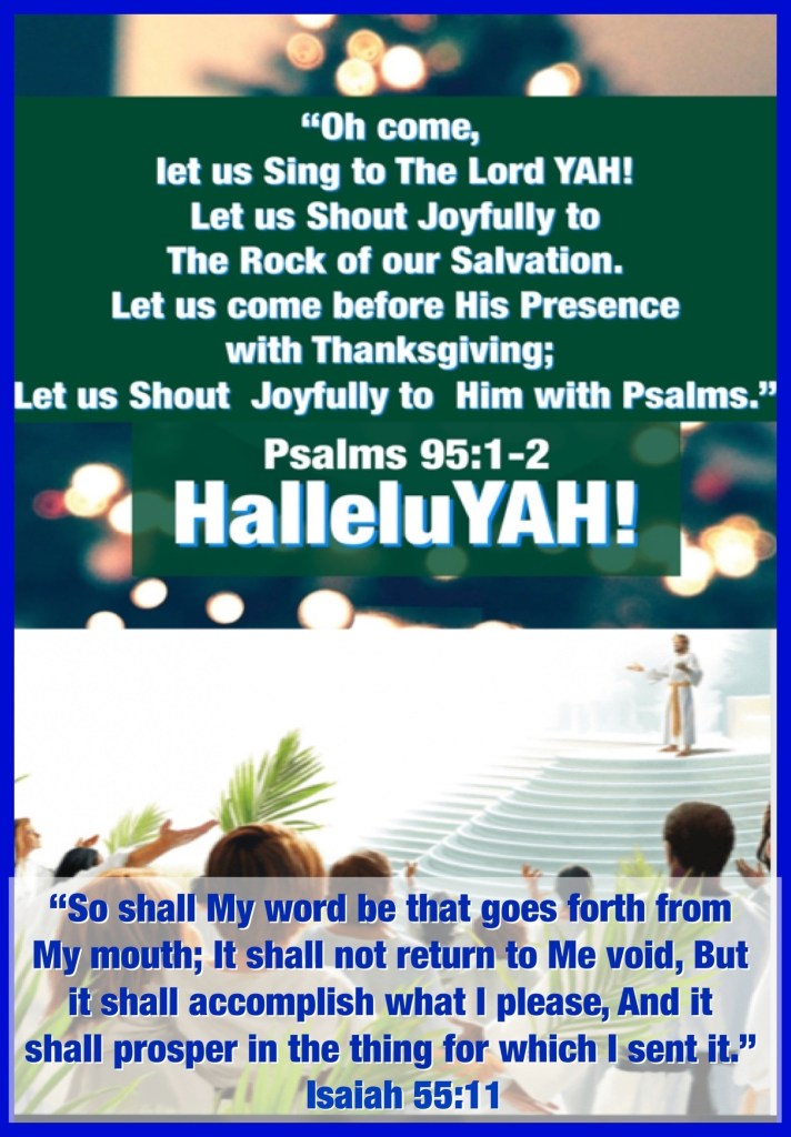 “Oh come, let us sing to The Lord! Let us shout joyfully to The Rock of our salvation. Let us come before His presence with thanksgiving; Let us shout joyfully to Him with psalms.” Psalms 95:1-2 “So shall My word be that goes forth from My mouth; It shall not return to Me void, But it shall accomplish what I please, And it shall prosper in the thing for which I sent it.” Isaiah 55:11