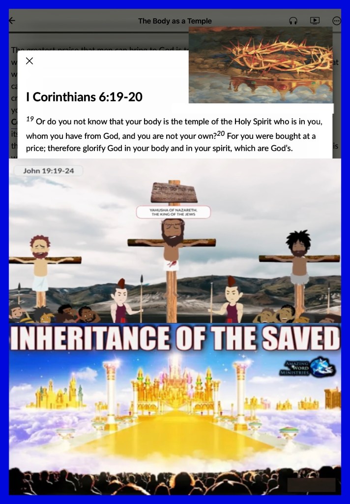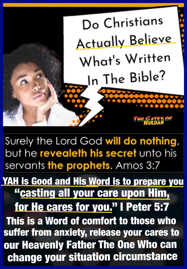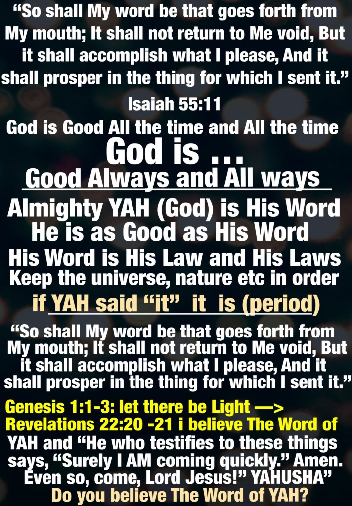 If I’ve made no other impression I pray that you have come to a deeper knowledge of YAH and His love for you, long before we were ever a thought in our parents minds, YAHUSHA HA’MASSIACH: Jesus Christ stared into eternity and spoke your name with love, YAH desires to save your mortal soul and gift you immortality, to take you incorruptible, up to Heaven with Him, that one day is coming soon, we will return Home with YAH but we need to be ready, stay ready and get others to know what time it is. I believe in The Word of YAH and His Scriptures so I send this lesson as all with love. YAH bless you, HalleluYAH!