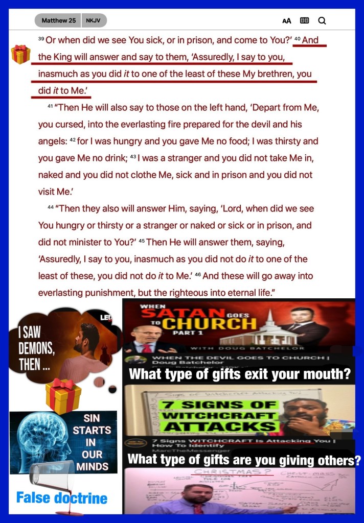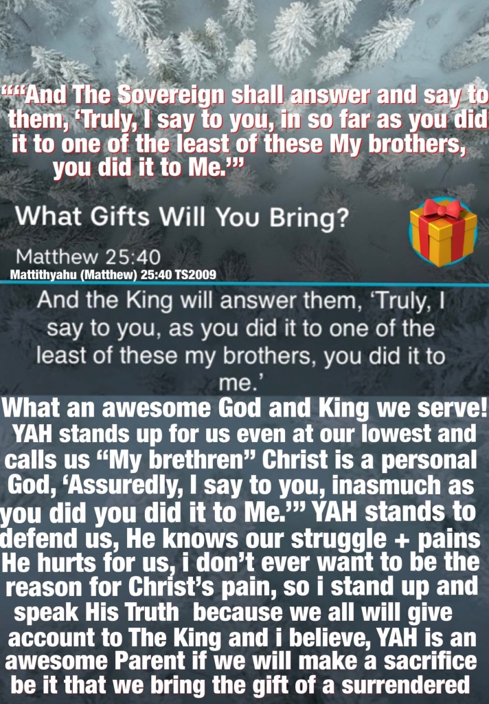 Mat 25:40 And the King shall answer and say unto them, Verily I say unto you, Inasmuch as ye have done it unto one of the least of these my brethren, ye have done it unto me.