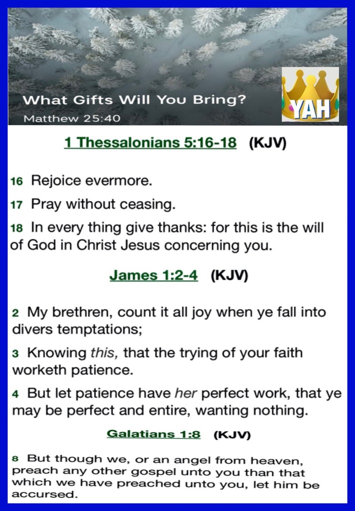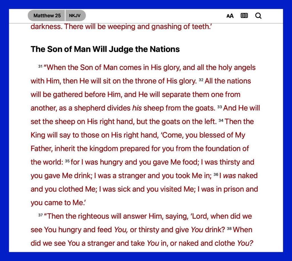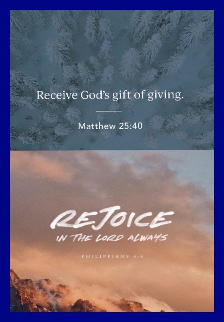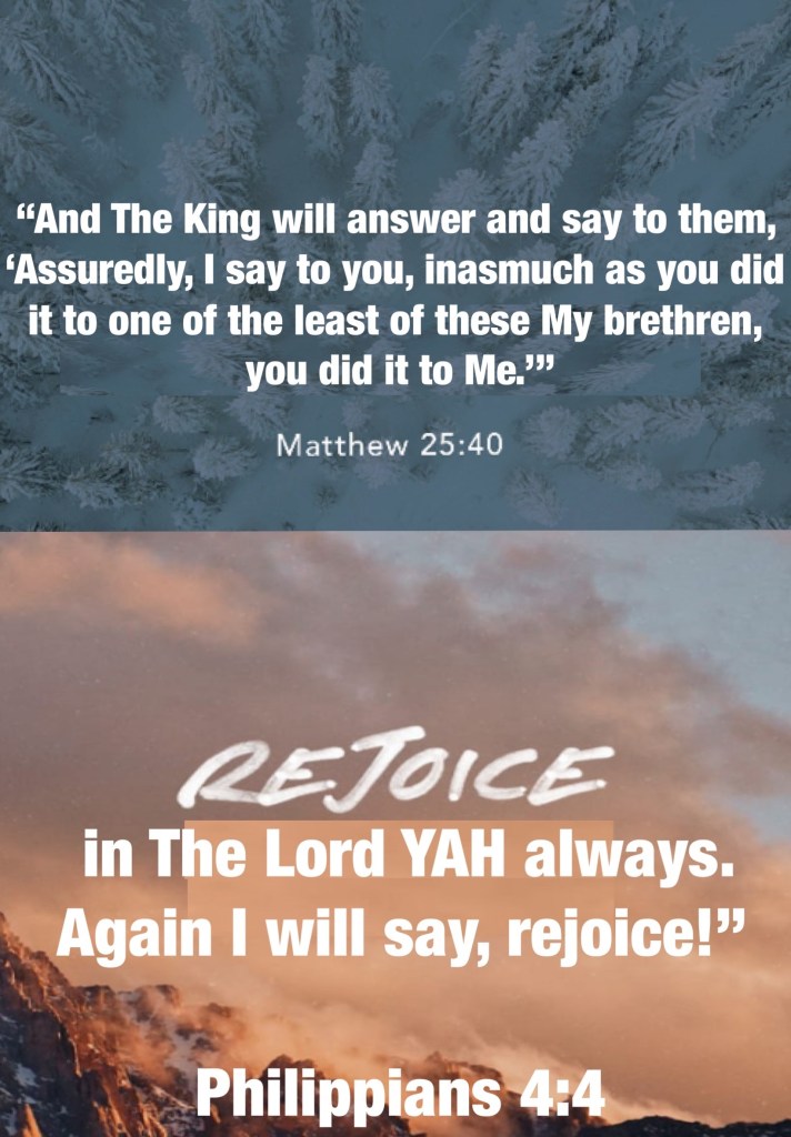 “And The King will answer and say to them, ‘Assuredly, I say to you, inasmuch as you did it to one of the least of these My brethren, you did it to Me.’” Matthew 25:40 “Rejoice in The Lord always. Again I will say, rejoice!” Philippians 4:4