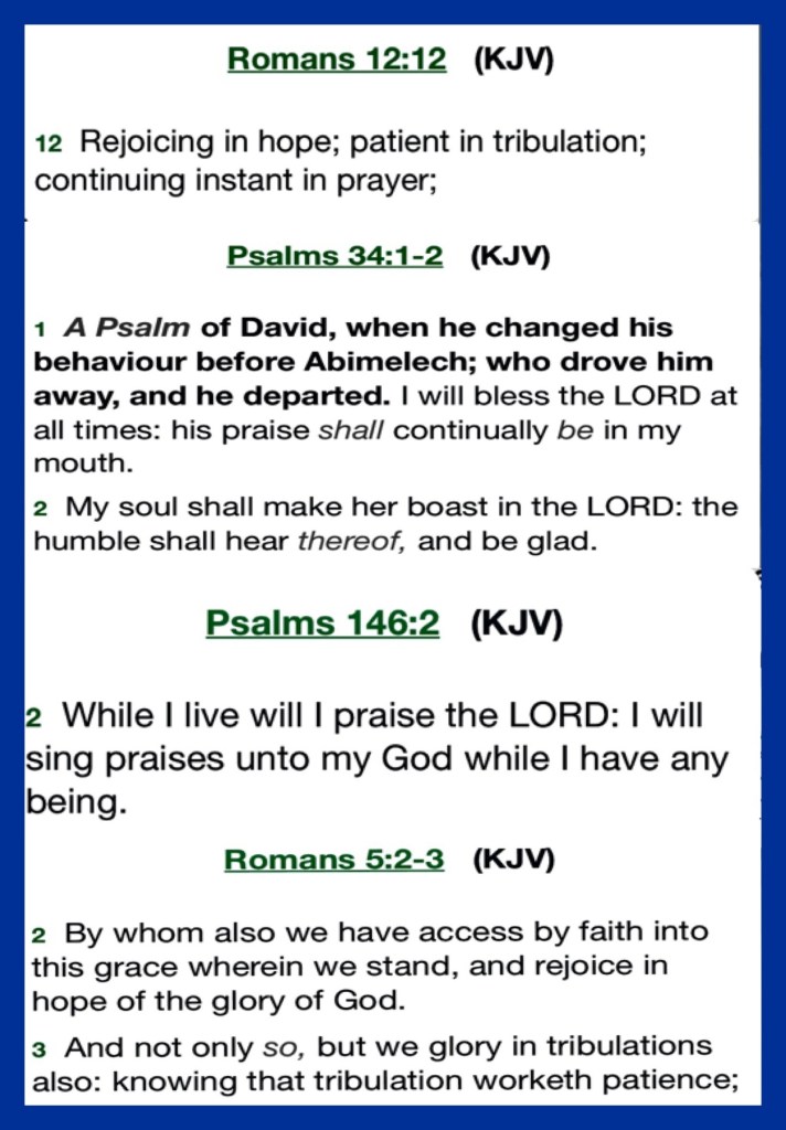 alway: Psa 34:1-2, Psa 145:1-2, Psa 146:2; Mat 5:12; Act 5:41, Act 16:25; Rom 5:2-3; 1Th 5:16-18; Jas 1:2-4; 1Pe 4:13