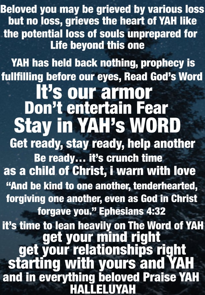May we all have the heart of YAH towards one another, the heart of YAH is a heart of Love: kindness, forgiveness, interceding for / praying for, weeping with/ supporting in ways that express the tenderness of the heart of YAH and glorify YAH as revealed in Christ and His Word, this beloved is our High Calling as children of The Most High God: YAH today may we reflect study and prepare our hearts, not only for the soon coming Sabbath but The return of our Wonderful Savior and Sabbath in The Kingdom of Heaven with YAH. GLORY HALLELUYAH