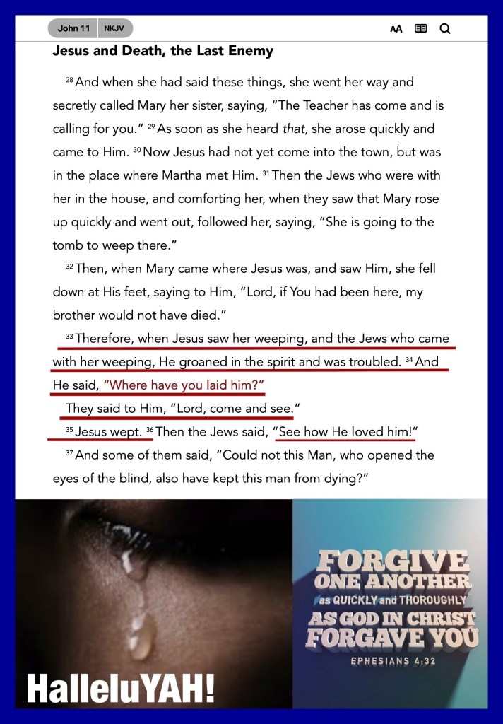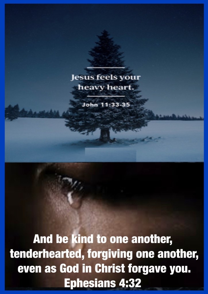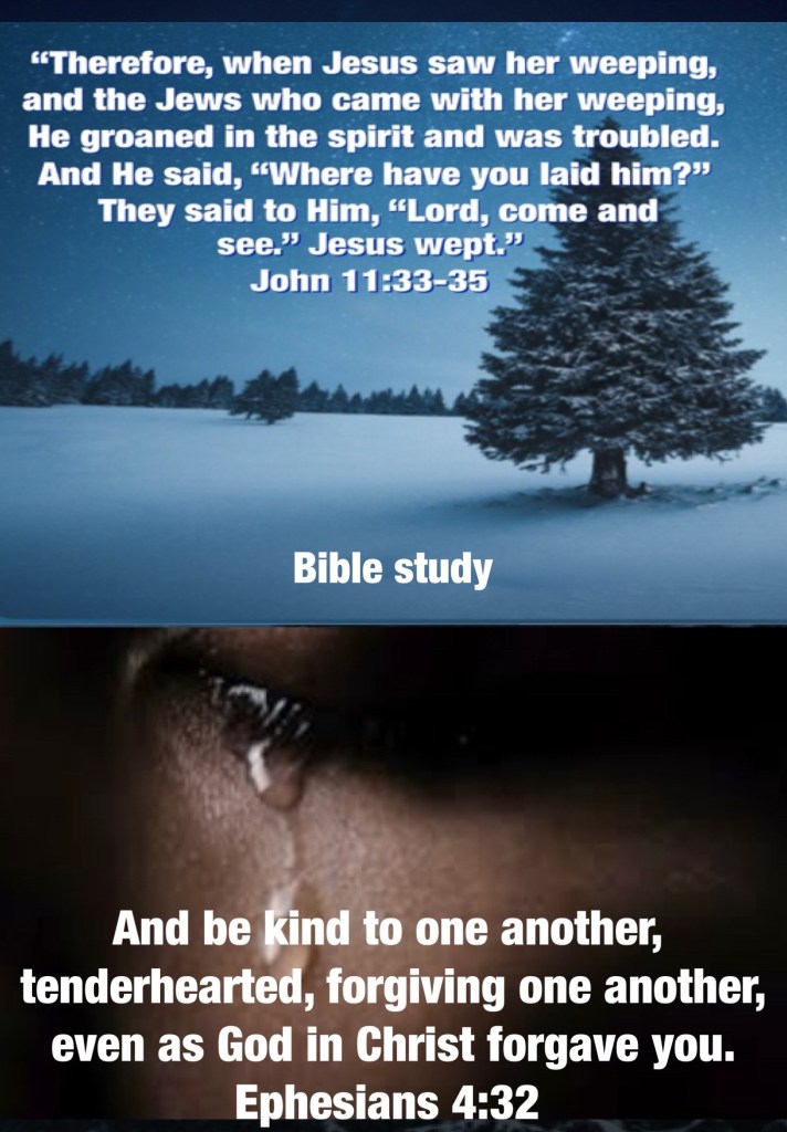 “Therefore, when Jesus saw her weeping, and the Jews who came with her weeping, He groaned in the spirit and was troubled. And He said, “Where have you laid him?” They said to Him, “Lord, come and see.” Jesus wept.” John 11:33-35 And be kind to one another, tenderhearted, forgiving one another, even as God in Christ forgave you. Ephesians 4:32