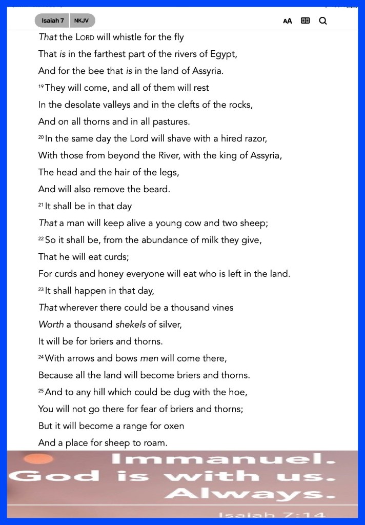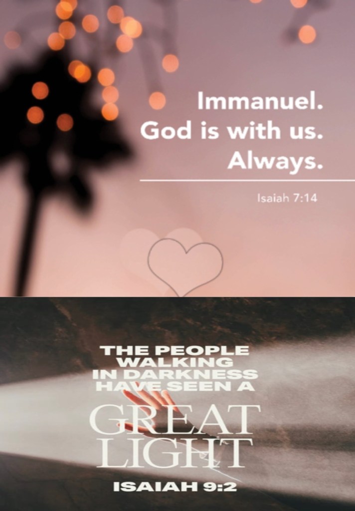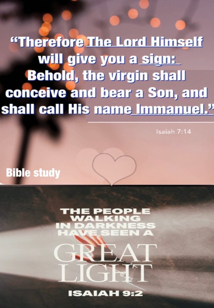 “Therefore The Lord Himself will give you a sign: Behold, the virgin shall conceive and bear a Son, and shall call His name Immanuel.” Isaiah 7:14 “The people who walked in darkness Have seen a great light; Those who dwelt in the land of the shadow of death, Upon them a light has shined.” Isaiah 9:2