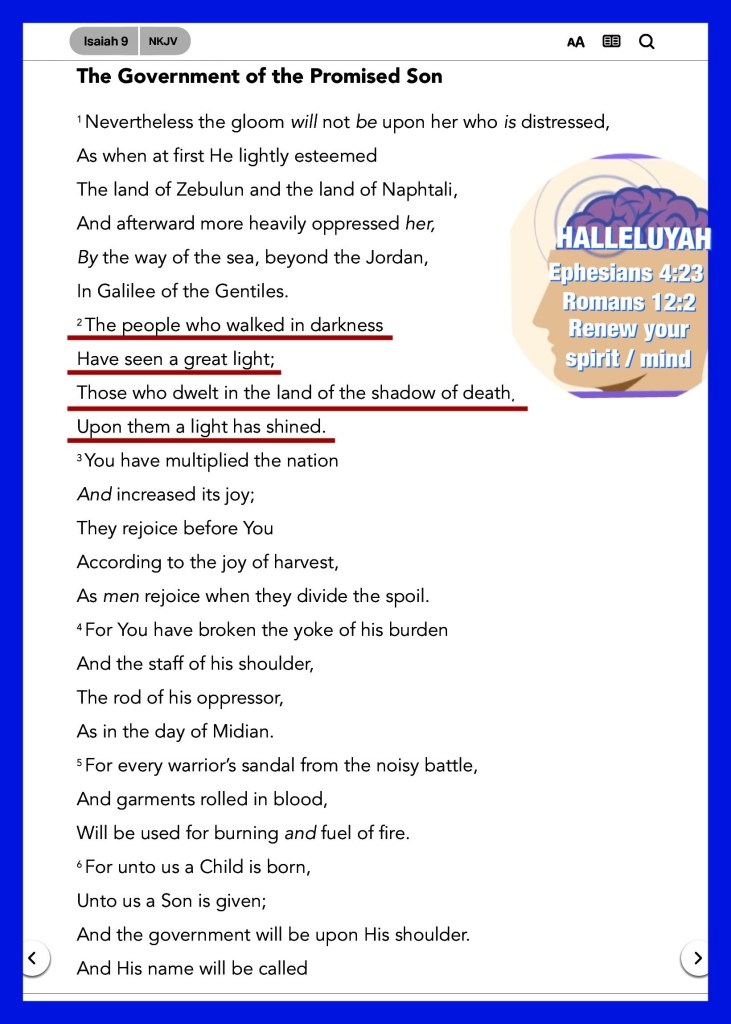 Isa 9:2 The people that walked in darkness have seen a great light: they that dwell in the land of the shadow of death, upon them hath the light shined.