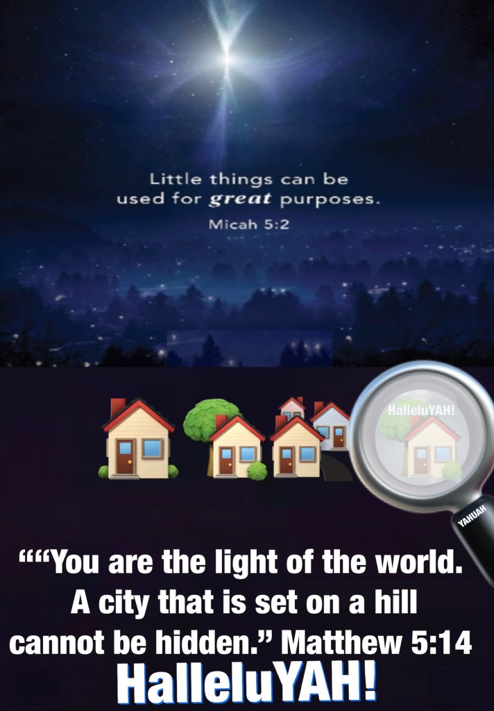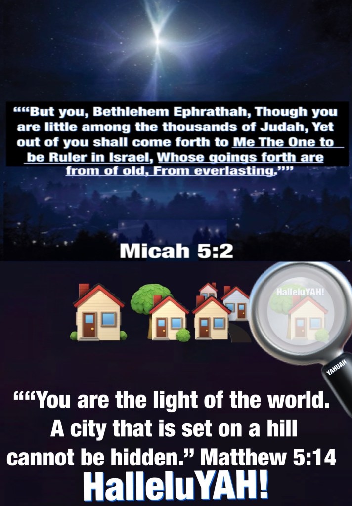 ““But you, Bethlehem Ephrathah, Though you are little among the thousands of Judah, Yet out of you shall come forth to Me The One to be Ruler in Israel, Whose goings forth are from of old, From everlasting.”” Micah 5:2 ““You are the light of the world. A city that is set on a hill cannot be hidden.” Matthew 5:14