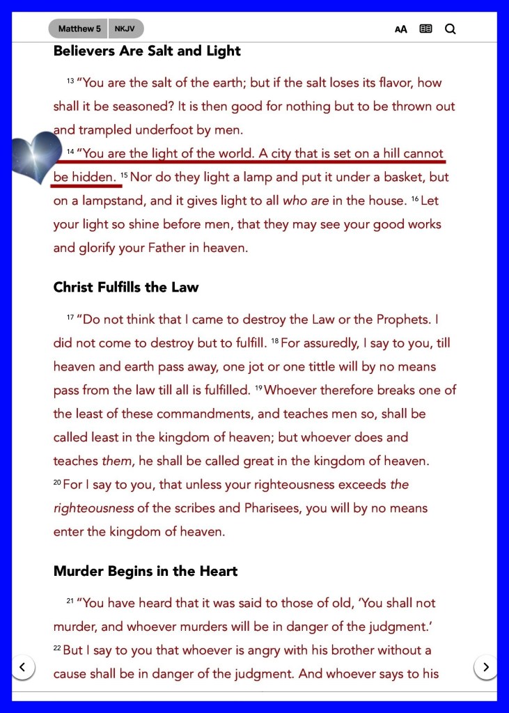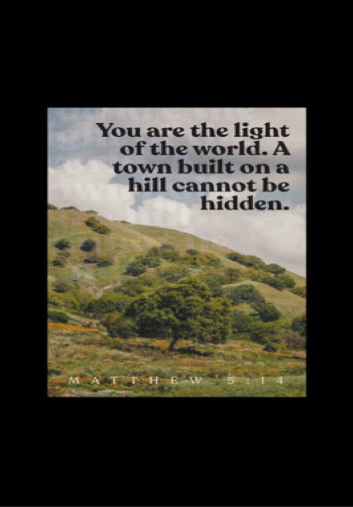 Mat 5:14 Ye are the light of the world. A city that is set on an hill cannot be hid.