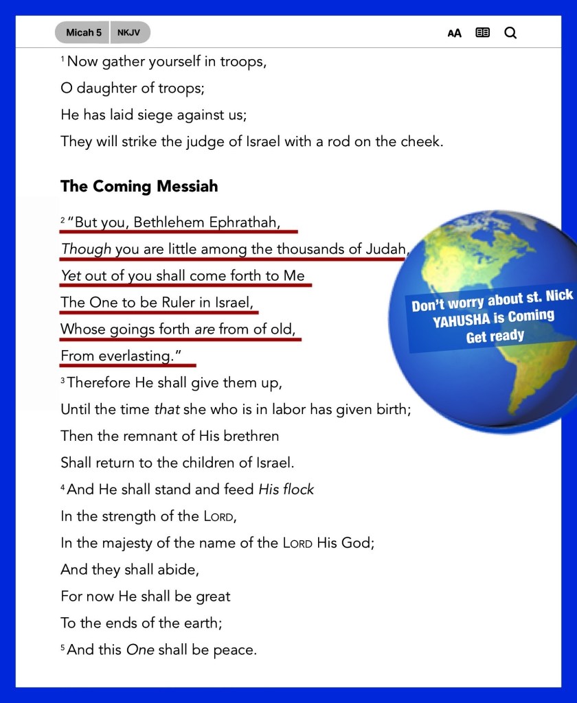 Mic 5:2 But thou, Bethlehem Ephratah, though thou be little among the thousands of Judah, yet out of thee shall he come forth unto me that is to be ruler in Israel; whose goings forth have been from of old, from everlasting.
