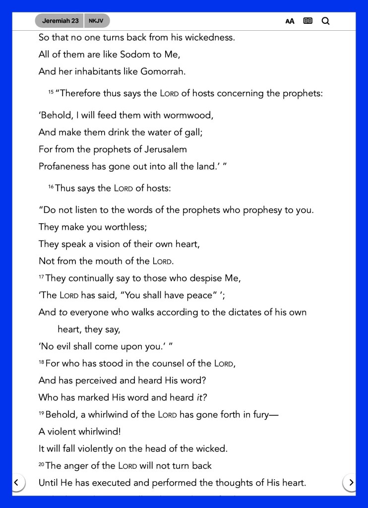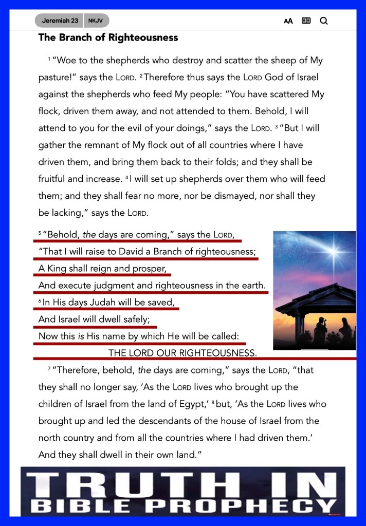 ““Behold, the days are coming,” says The Lord, “That I will raise to David a Branch of righteousness; A King shall reign and prosper, And execute judgment and righteousness in the earth. In His days Judah will be saved, And Israel will dwell safely; Now this is His Name by which He will be called: THE LORD OUR RIGHTEOUSNESS.” Jeremiah 23:5-6 “For unto us a Child is born, Unto us a Son is given; And the government will be upon His shoulder. And His Name will be called Wonderful, Counselor, Mighty God, Everlasting Father, Prince of Peace.” Isaiah 9:6