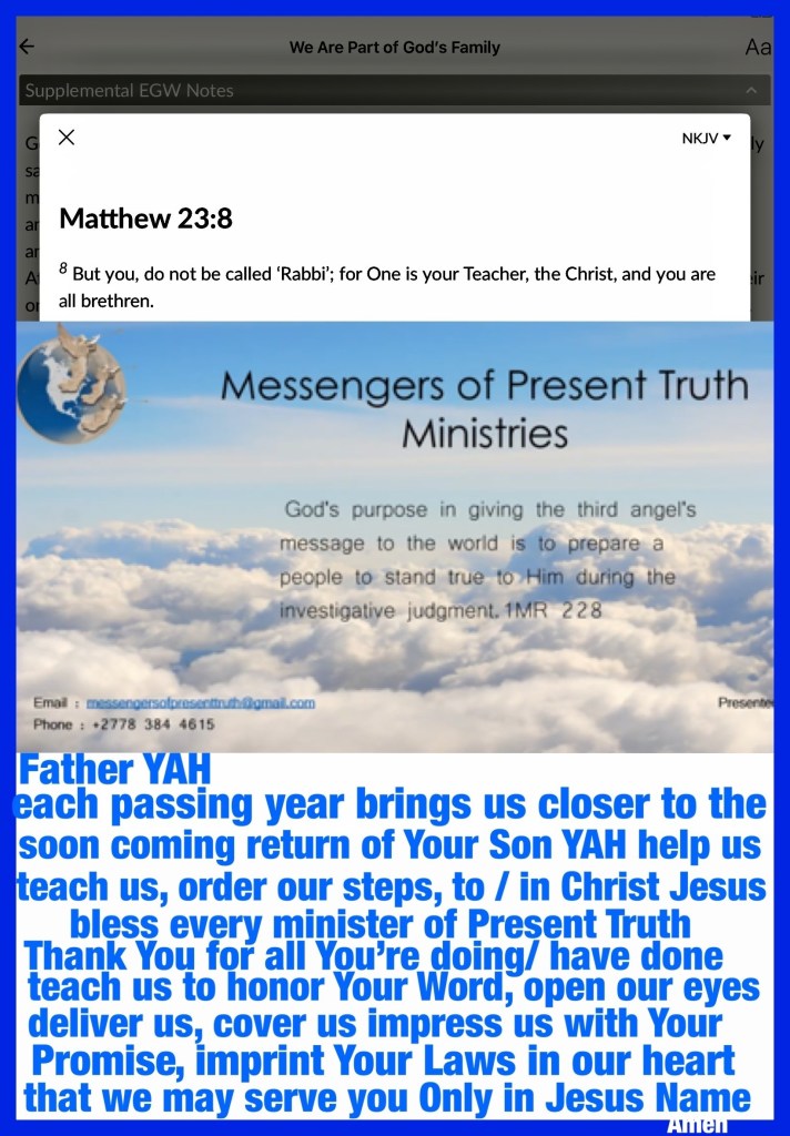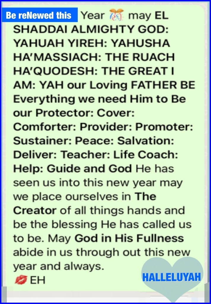 Greetings of grace and peace beloved children of YAH more than anything else I pray we allow the LOVE of YAH to permeate our heart mind soul keeping us firmly clasped in the arms of Christ Jesus our Creator Savior Love and God, as we draw nearer to the great controversy and close of probation, I pray for the saving of our souls: be At One with Christ in spirit and in truth, be reformed, renewed, refreshed living in obedience to The Loving Law: The Word of YAH this is my new year’s prayer for you and your household family and friends I love you brothers and sisters but YAHUAH Loves you more. Walk in His Goodness Light and Love. In Jesus Christ Name: YAHUSHA Ha’MASSIACH I pray come into our heart life situations with healing. Amen. 💋EH