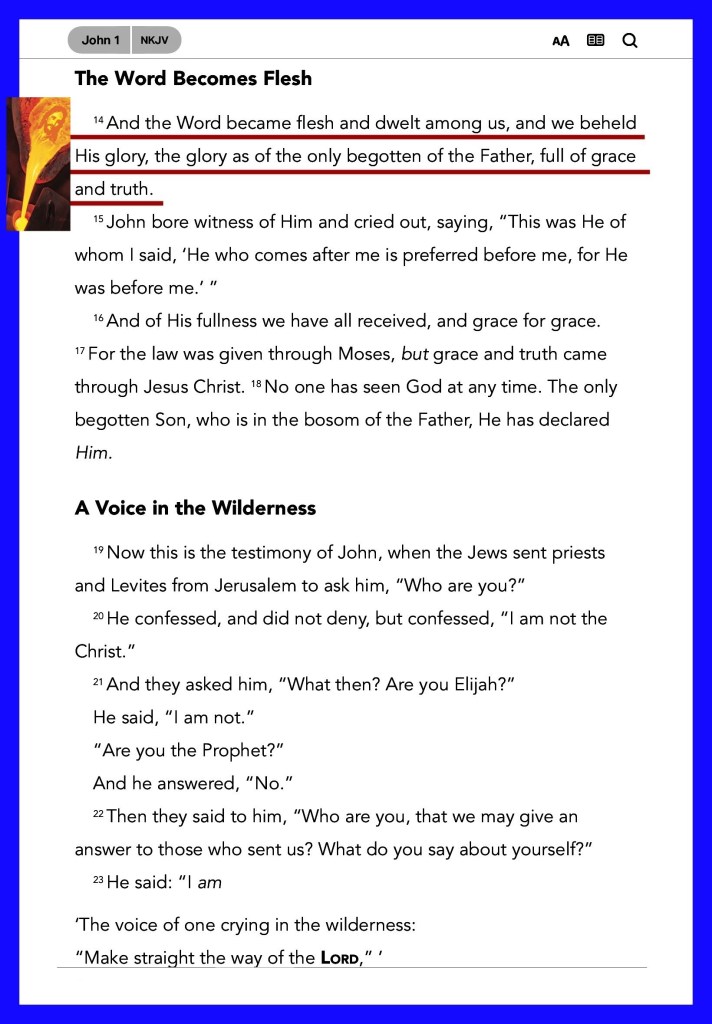 Joh 1:14 And the Word was made flesh, and dwelt among us, (and we beheld his glory, the glory as of the only begotten of the Father,) full of grace and truth.