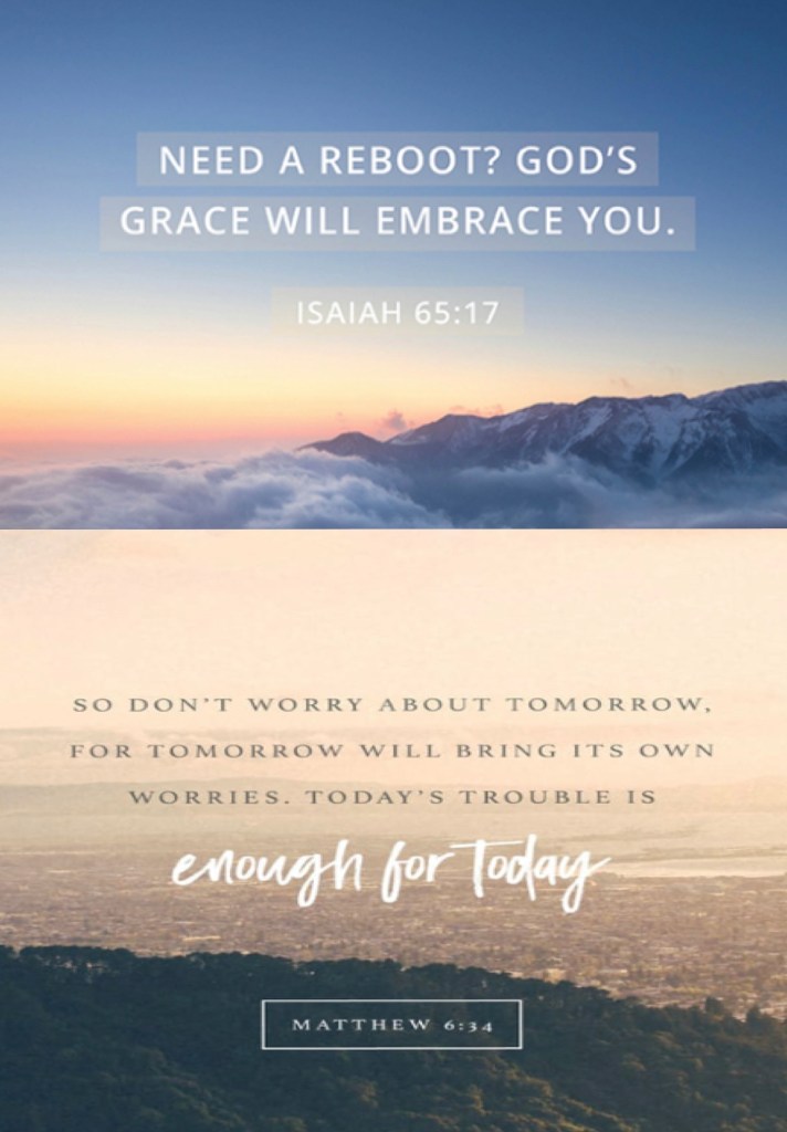 ““For behold, I create new heavens and a new earth; And the former shall not be remembered or come to mind.” Isaiah 65:17 “And Jesus said to him, “Today salvation has come to this house, because he also is a son of Abraham; for The Son of Man has come to seek and to save that which was lost.”” Luke 19:9-10 “Therefore do not worry about tomorrow, for tomorrow will worry about its own things. Sufficient for the day is its own trouble.” Matthew 6:34