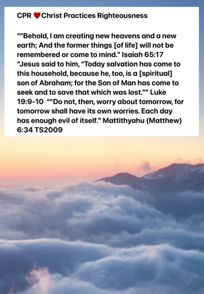 ““Behold, I am creating new heavens and a new earth; And the former things [of life] will not be remembered or come to mind.” Isaiah 65:17 “Jesus said to him, “Today salvation has come to this household, because he, too, is a [spiritual] son of Abraham; for the Son of Man has come to seek and to save that which was lost.”” Luke 19:9-10 ““Do not, then, worry about tomorrow, for tomorrow shall have its own worries. Each day has enough evil of itself.” Mattithyahu (Matthew) 6:34 TS2009