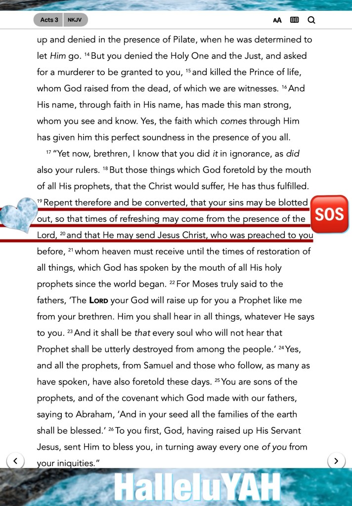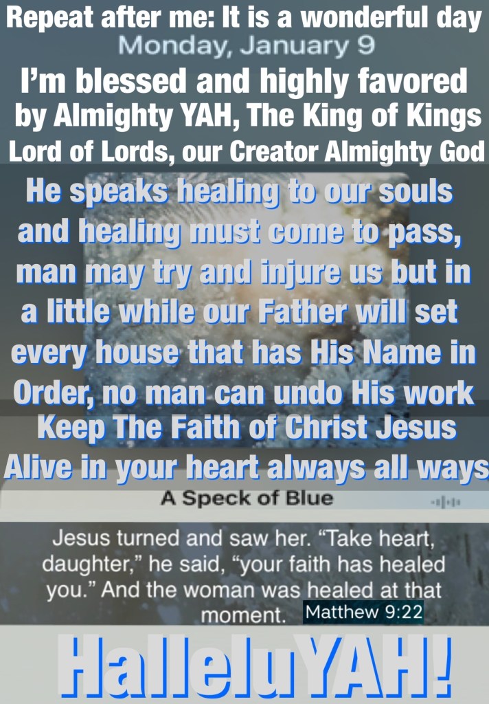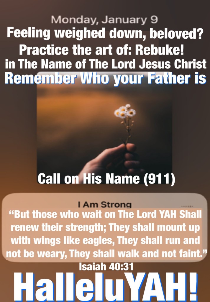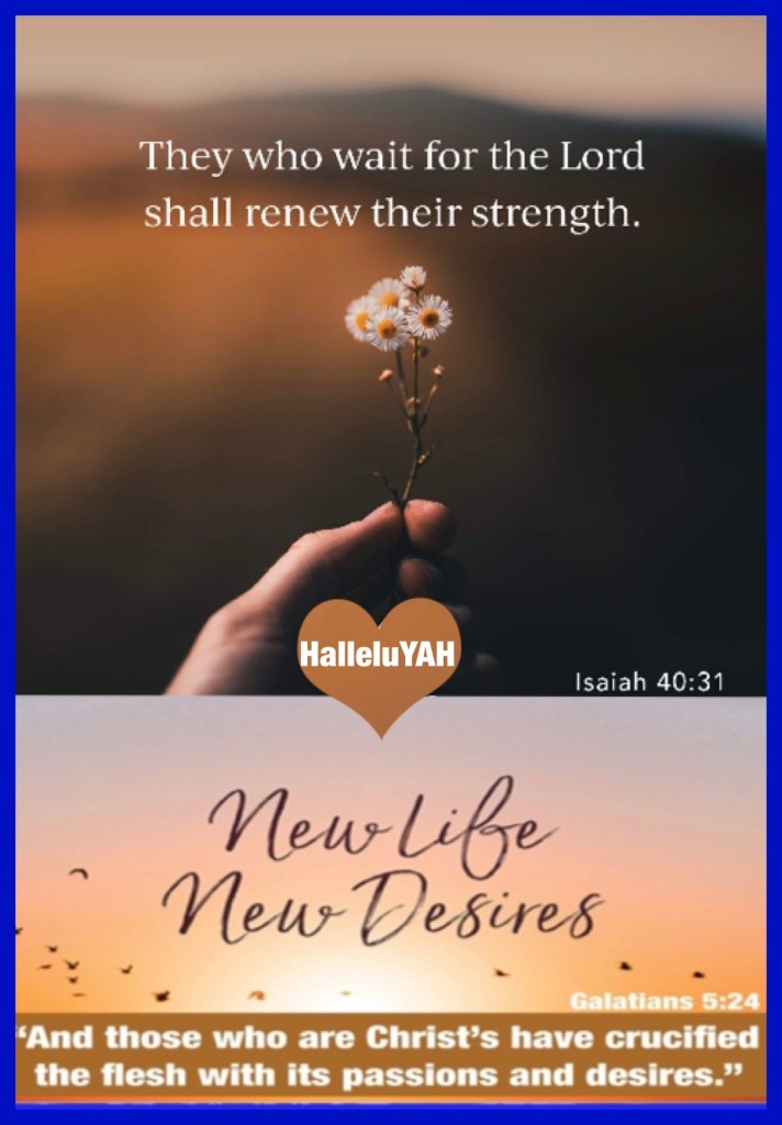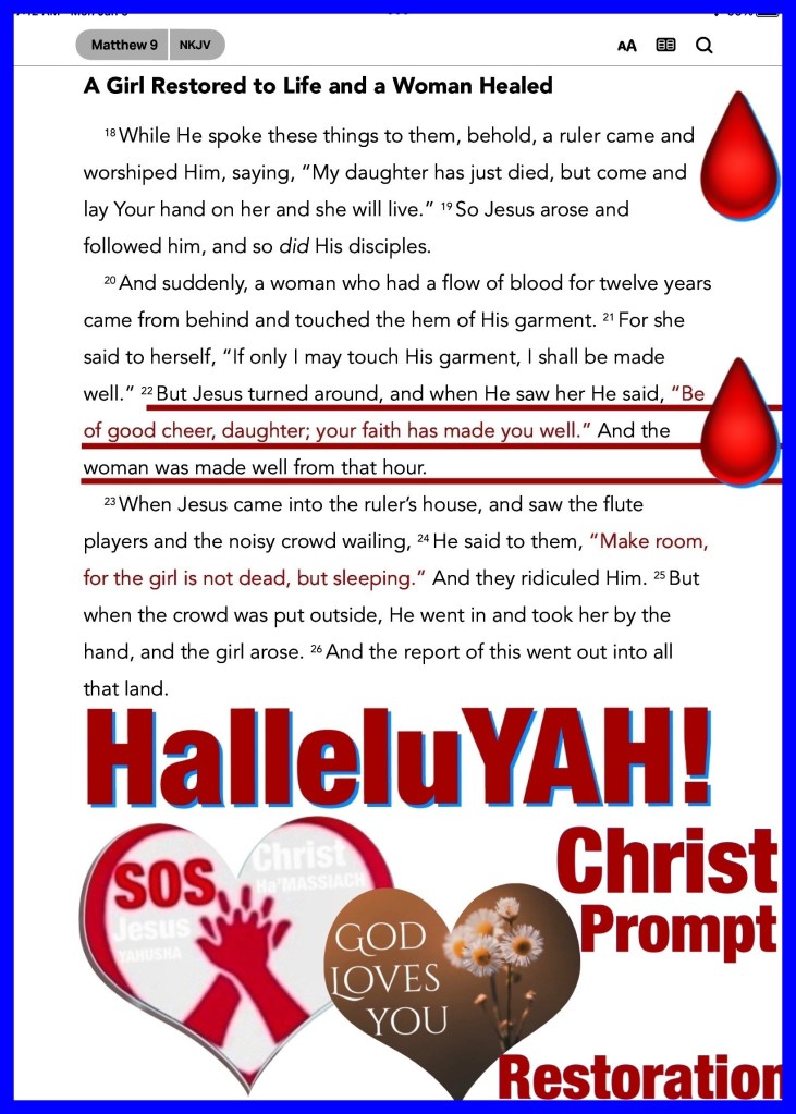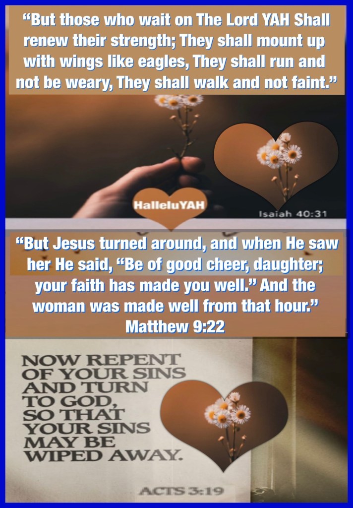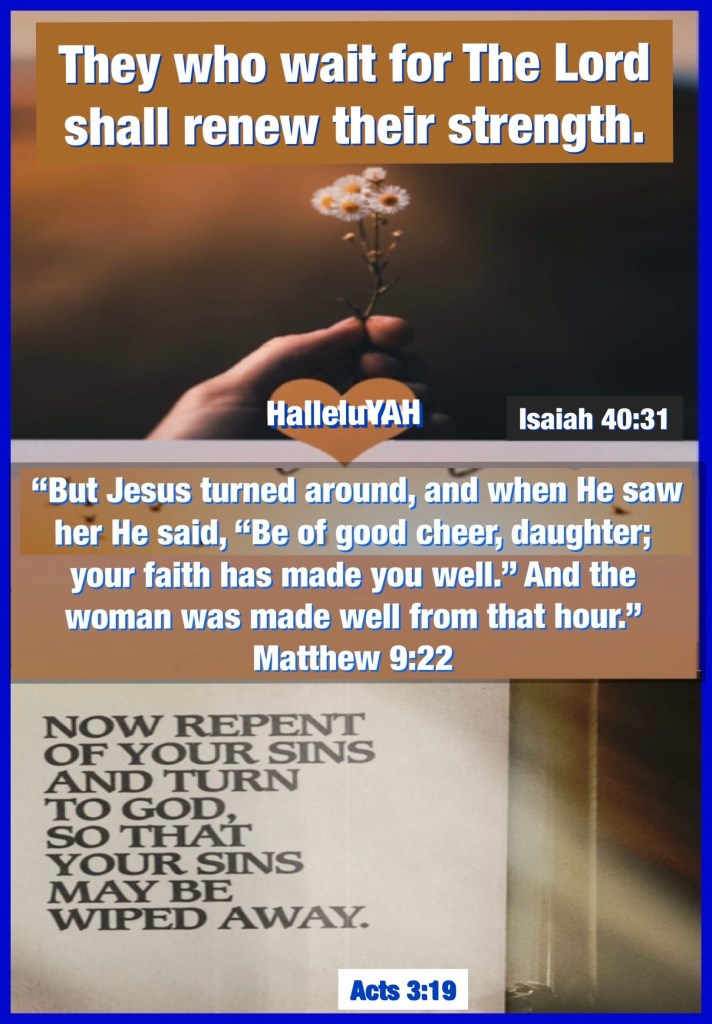 βBut those who wait on The Lord YAH Shall renew their strength; They shall mount up with wings like eagles, They shall run and not be weary, They shall walk and not faint.β Isaiah 40:31 βBut Jesus turned around, and when He saw her He said, βBe of good cheer, daughter; your faith has made you well.β And the woman was made well from that hour.β Matthew 9:22 βRepent therefore and be converted, that your sins may be blotted out, so that times of refreshing may come from the presence of The Lord YAH,β Acts 3:19