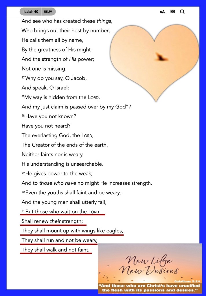 Isa 40:31 But they that wait upon the LORD shall renew their strength; they shall mount up with wings as eagles; they shall run, and not be weary; and they shall walk, and not faint.