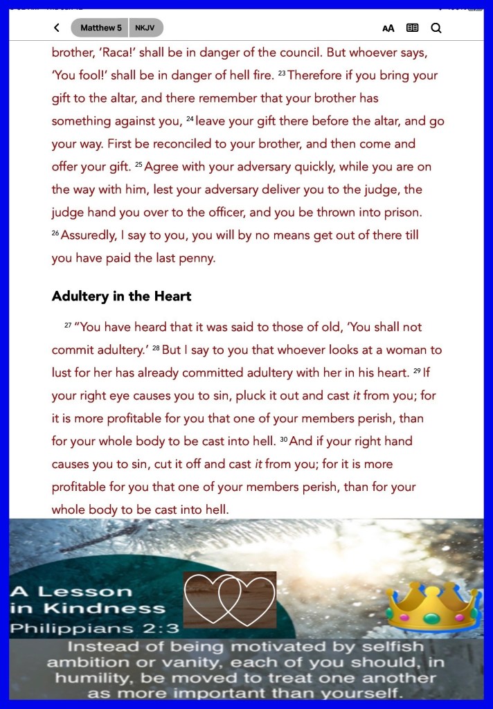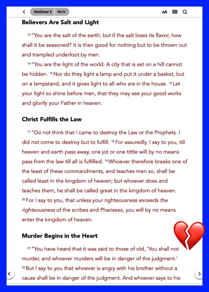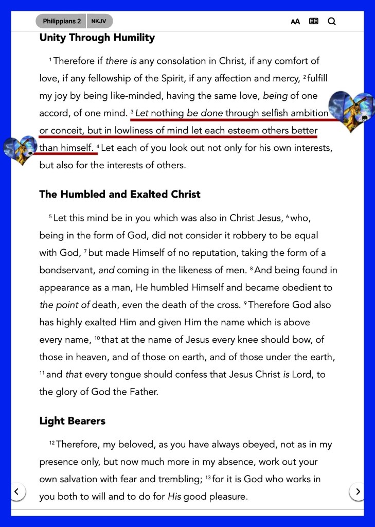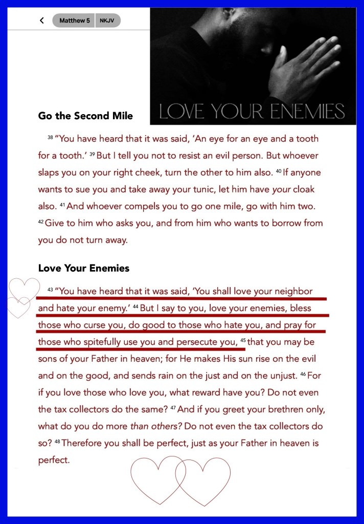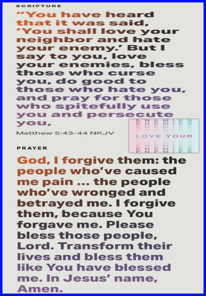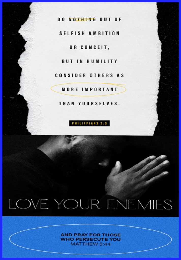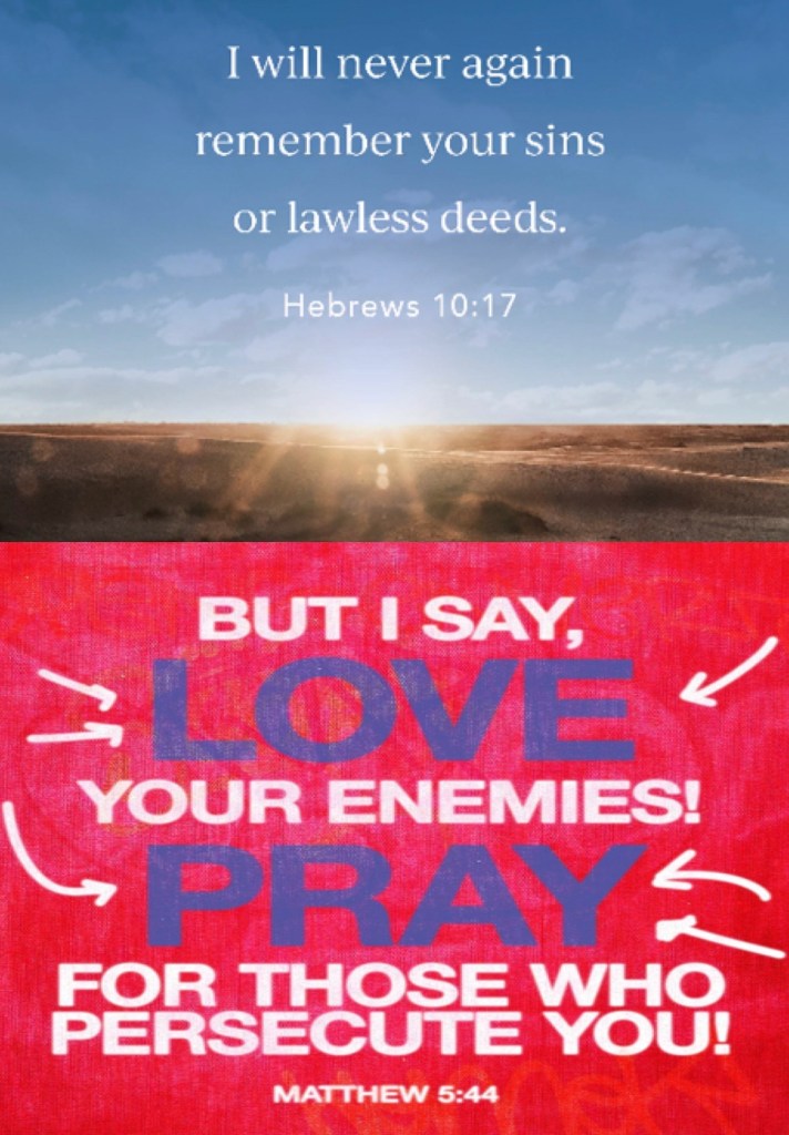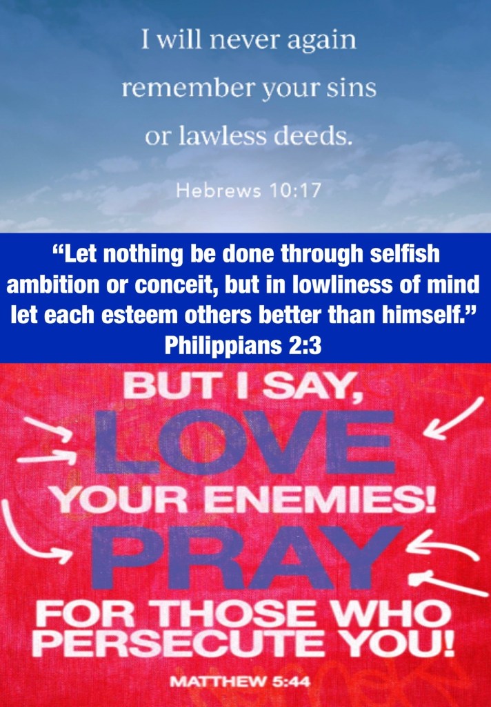 “then He adds, “Their sins and their lawless deeds I will remember no more.””Hebrews 10:17 “Let nothing be done through selfish ambition or conceit, but in lowliness of mind let each esteem others better than himself.” Philippians 2:3 ““You have heard that it was said, ‘You shall love your neighbor and hate your enemy.’ But I say to you, love your enemies, bless those who curse you, do good to those who hate you, and pray for those who spitefully use you and persecute you,” Matthew 5:43-44