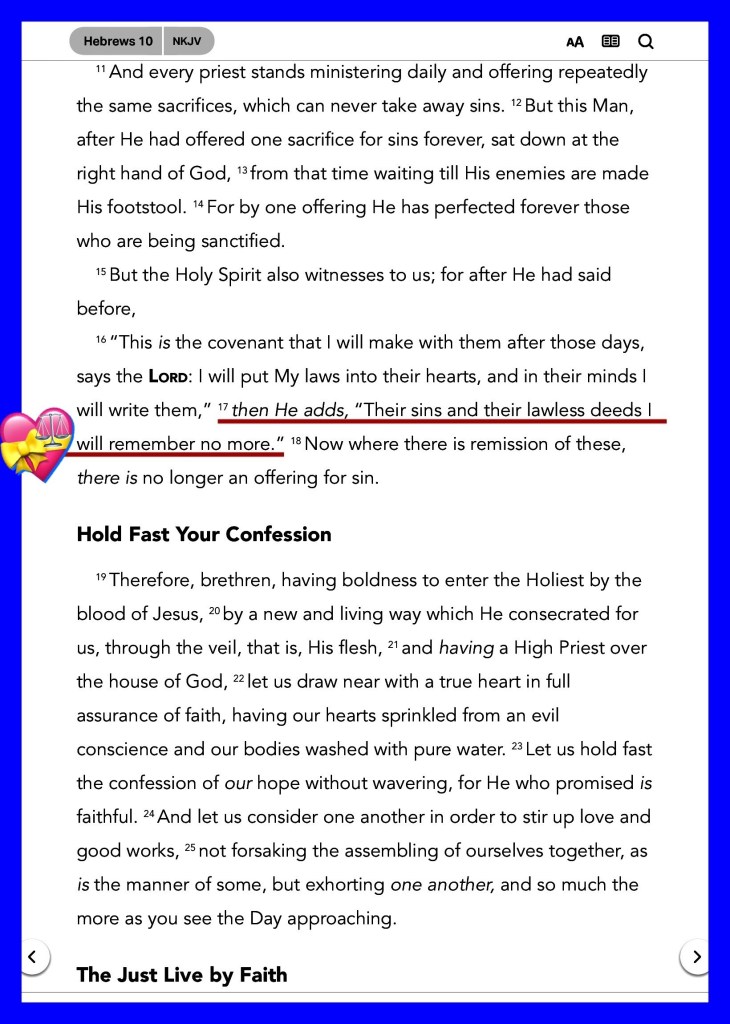 Heb 10:17 And their sins and iniquities will I remember no more.