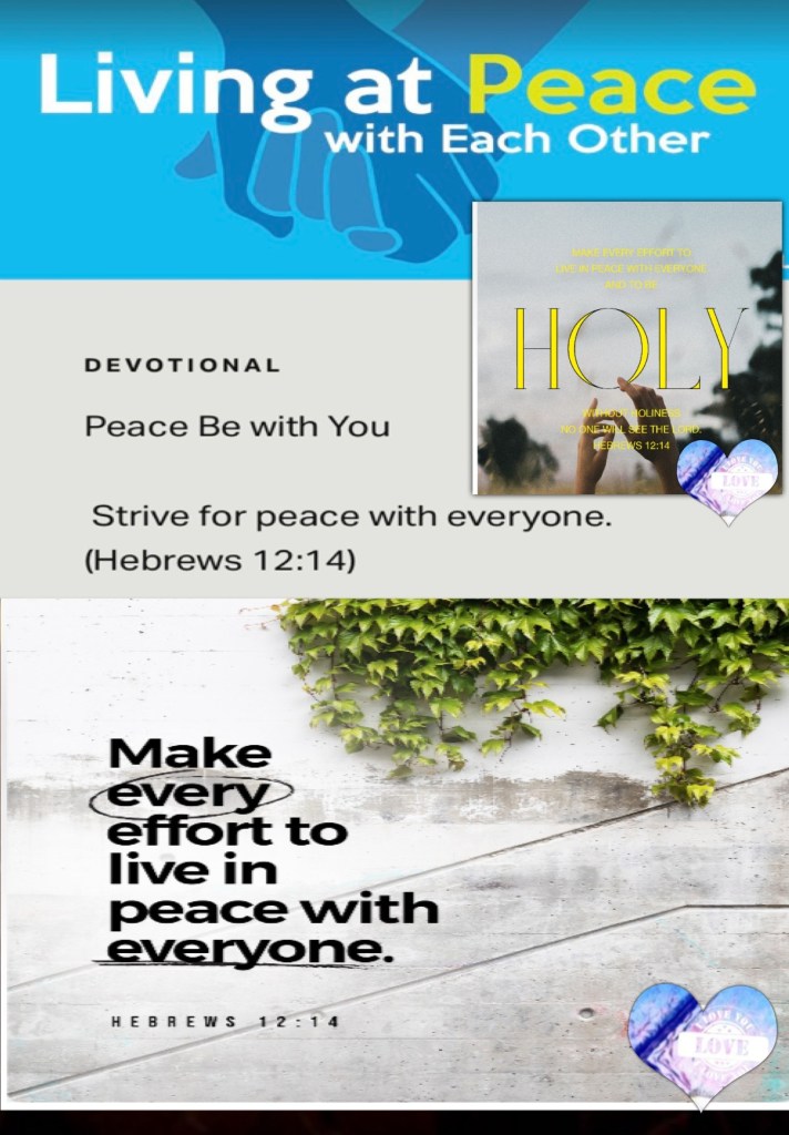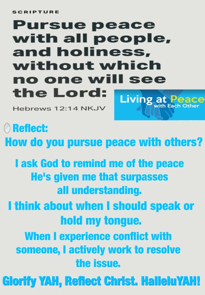 Follow: Gen 13:7-9; Psa 34:14, Psa 38:20, Psa 120:6, Psa 133:1; Pro 15:1, Pro 16:7, Pro 17:14; Isa 11:6-9; Mat 5:9; Mar 9:50; Rom 12:18, Rom 14:19; 1Co 1:10; Gal 5:22-23; Eph 4:1-8; 1Th 5:15; 1Ti 6:11; 2Ti 2:22; Jas 3:17-18; 1Pe 3:11