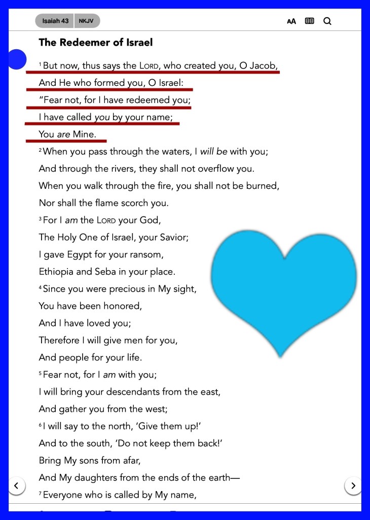 Isa 43:1 But now thus saith the LORD that created thee, O Jacob, and he that formed thee, O Israel, Fear not: for I have redeemed thee, I have called thee by thy name; thou art mine.