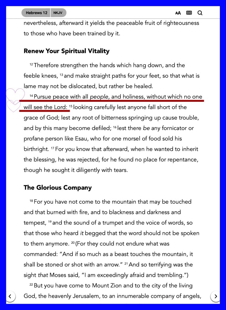 Heb 12:14 Follow peace with all men, and holiness, without which no man shall see the Lord: