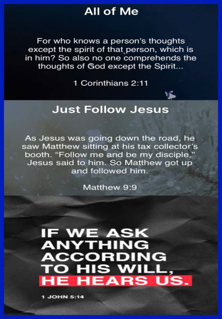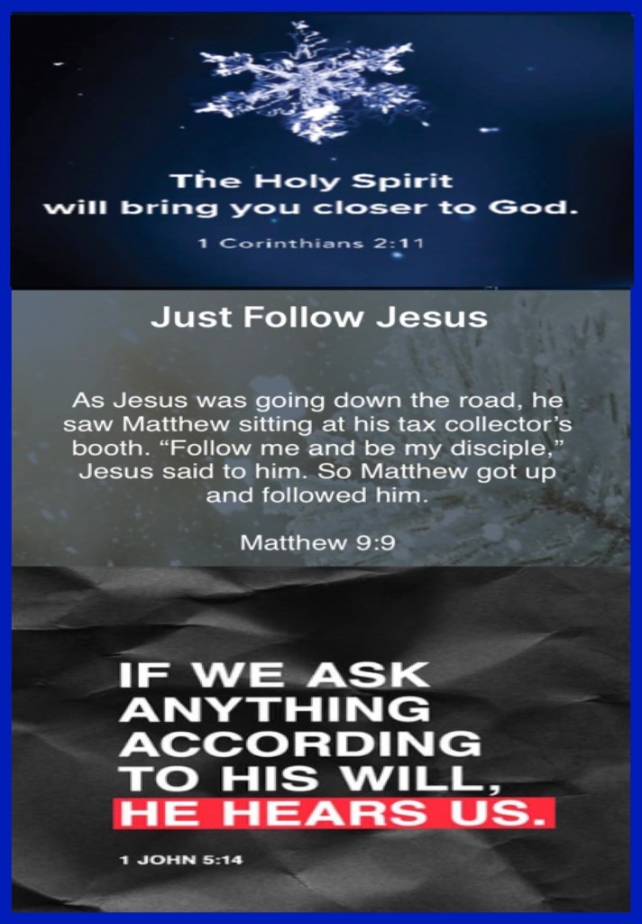 “For what man knows the things of a man except the spirit of the man which is in him? Even so no one knows the things of God except The Spirit of God.” I Corinthians 2:11 “As Jesus passed on from there, He saw a man named Matthew sitting at the tax office. And He said to him, “Follow Me.” So he arose and followed Him.” Matthew 9:9 “Now this is the confidence that we have in Him, that if we ask anything according to His will, He hears us.” I John 5:14