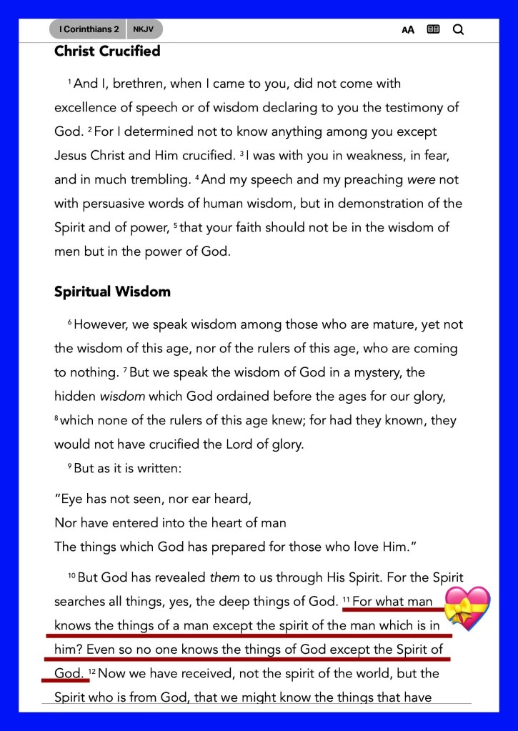 1Co 2:11 For what man knoweth the things of a man, save the spirit of man which is in him? even so the things of God knoweth no man, but the Spirit of God.