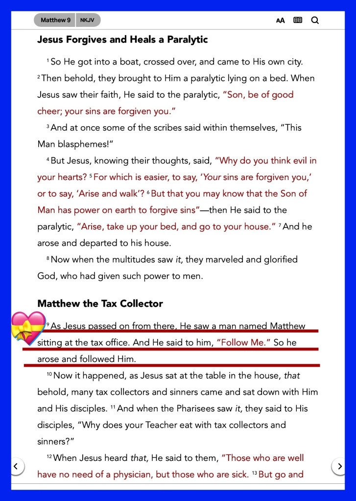 Mat 9:9 And as Jesus passed forth from thence, he saw a man, named Matthew, sitting at the receipt of custom: and he saith unto him, Follow me. And he arose, and followed him.