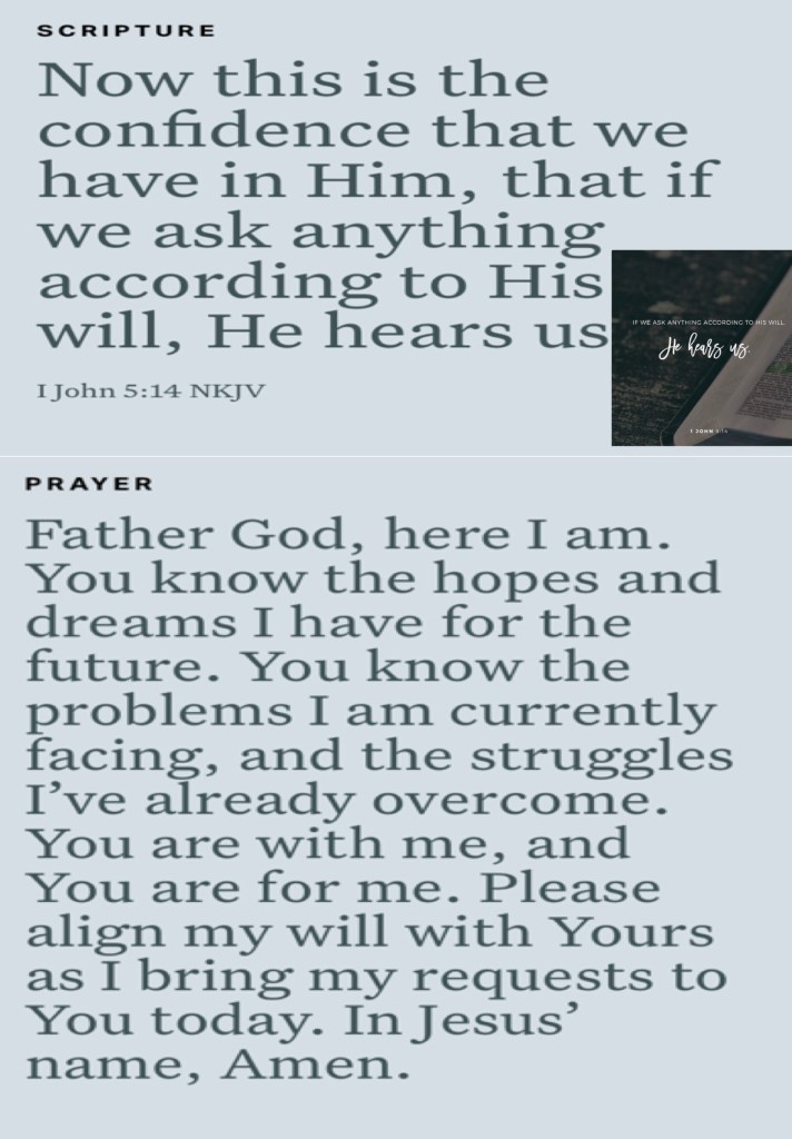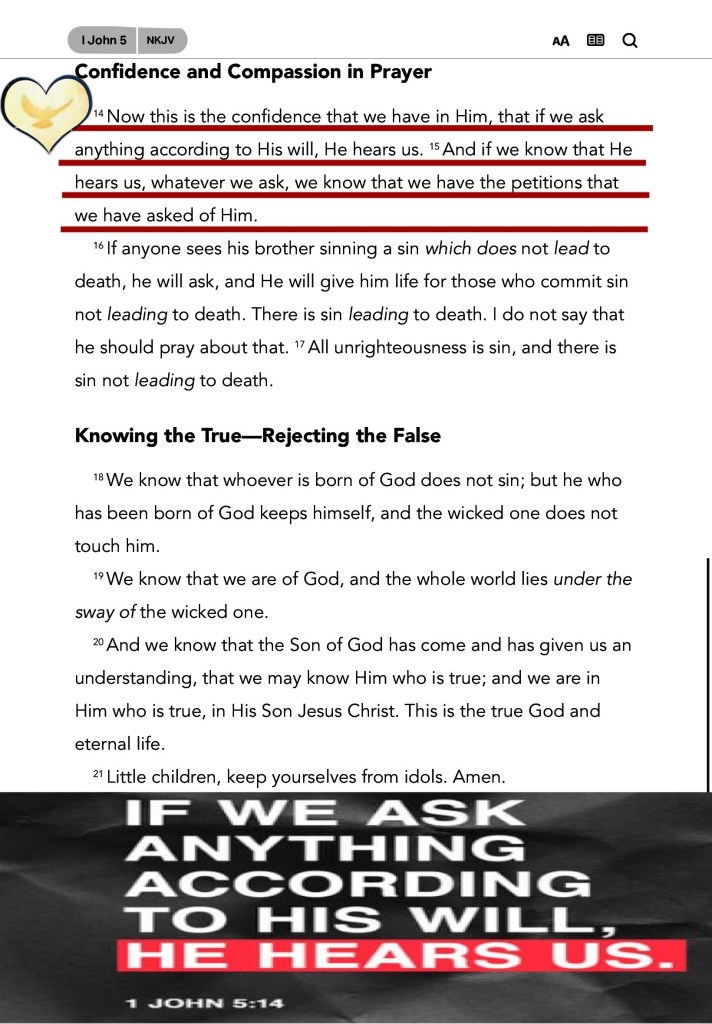 1Jn 5:14 And this is the confidence that we have in him, that, if we ask any thing according to his will, he heareth us: