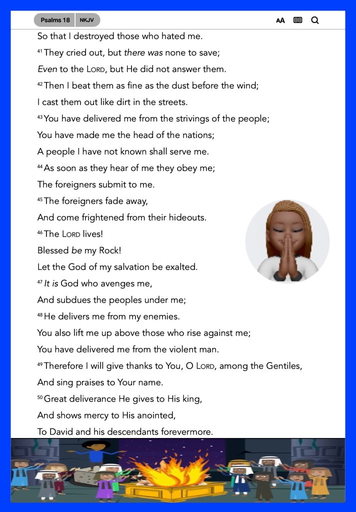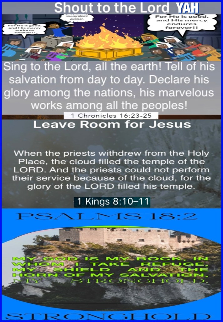 “Sing to The Lord, all the earth; Proclaim the good news of His salvation from day to day. Declare His glory among the nations, His wonders among all peoples. For The Lord is great and greatly to be praised; He is also to be feared above all gods.”I Chronicles 16:23-25 “And it came to pass, when the priests came out of the holy place, that the cloud filled the house of The Lord, so that the priests could not continue ministering because of The Cloud; for The Glory of The Lord filled the house of The Lord.” I Kings 8:10-11 “The Lord is my rock and my fortress and my deliverer; My God, my strength, in whom I will trust; My shield and the horn of my salvation, my stronghold.” Psalms 18:2