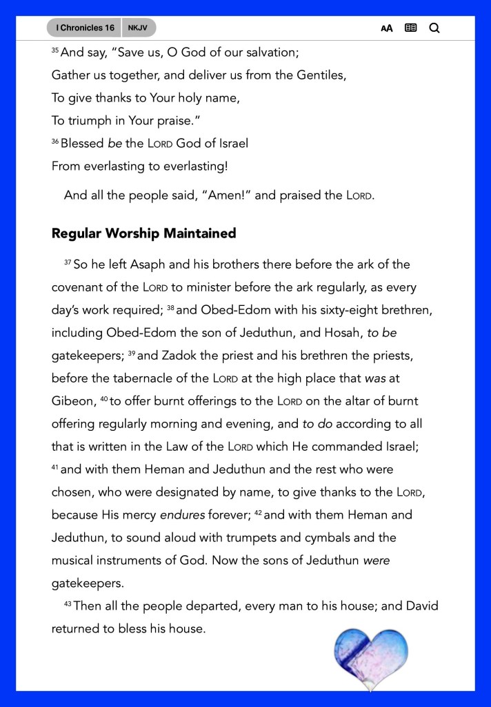 1Ch 16:23 Sing unto the LORD, all the earth; shew forth from day to day his salvation.