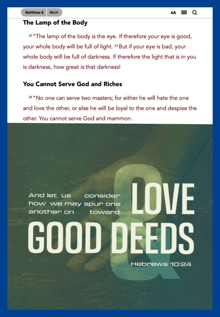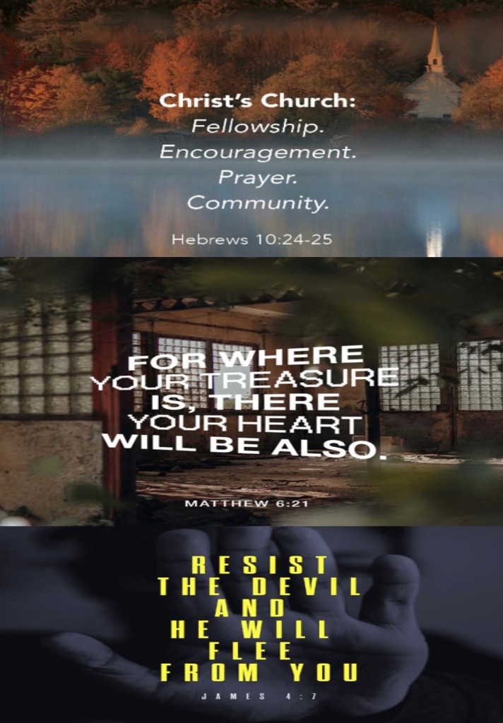 βAnd let us consider one another in order to stir up love and good works, not forsaking the assembling of ourselves together, as is the manner of some, but exhorting one another, and so much the more as you see the Day approaching.β Hebrews 10:24-25 βFor where your treasure is, there your heart will be also.β Matthew 6:21 βTherefore submit to God. Resist the devil and he will flee from you.β James 4:7