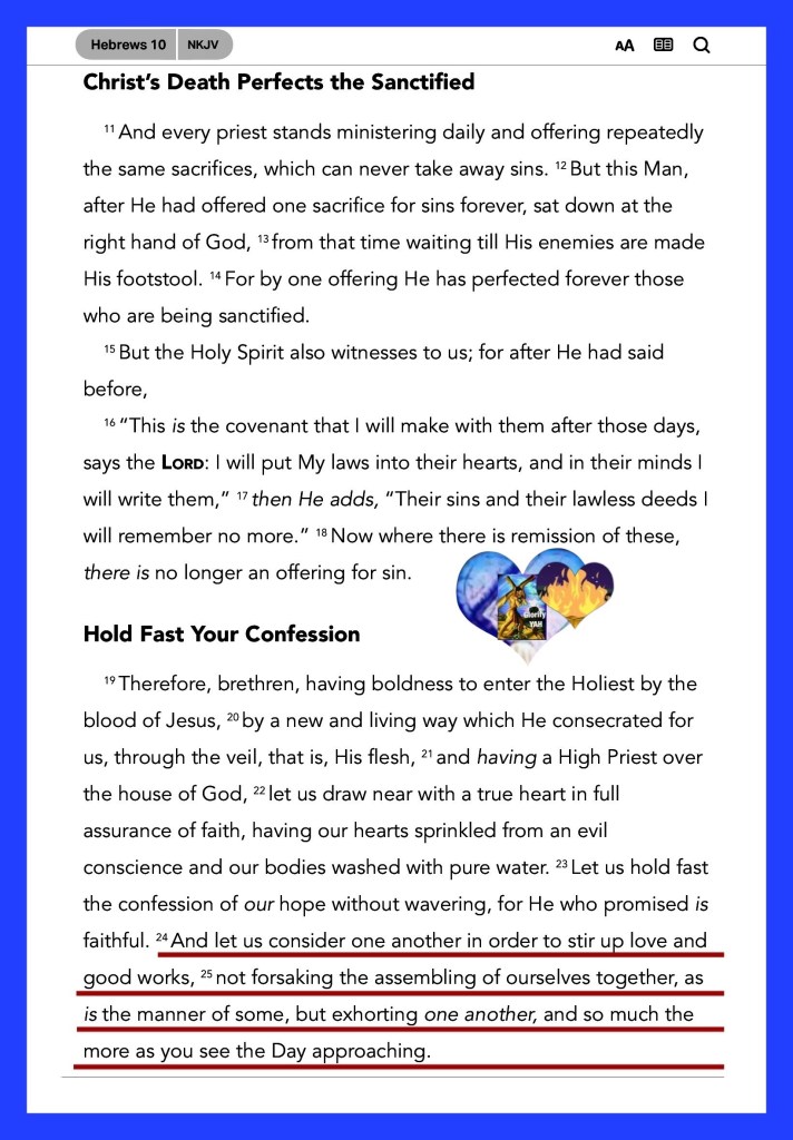 Heb 10:25 Not forsaking the assembling of ourselves together, as the manner of some is; but exhorting one another: and so much the more, as ye see the day approaching.