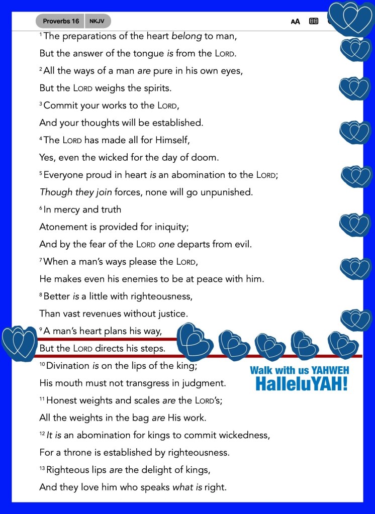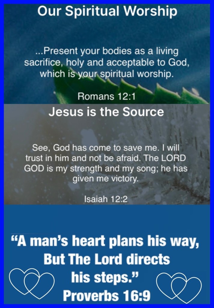 βI beseech you therefore, brethren, by the mercies of God, that you present your bodies a living sacrifice, holy, acceptable to God, which is your reasonable service.βRomans 12:1 βBehold, God is my salvation, I will trust and not be afraid; βFor YAH, The Lord, is my strength and song; He also has become my salvation.β ββIsaiah 12:2 βA manβs heart plans his way, But The Lord directs his steps.βProverbs 16:9