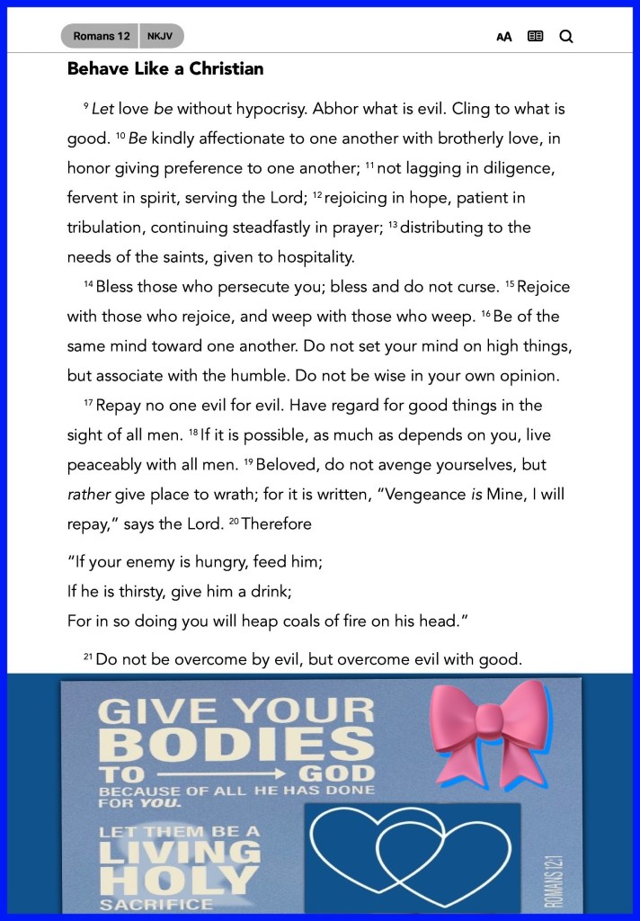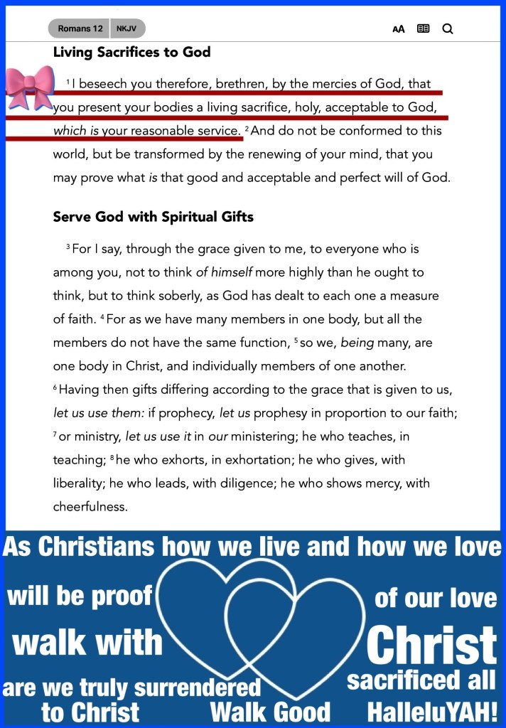 Rom 12:1 I beseech you therefore, brethren, by the mercies of God, that ye present your bodies a living sacrifice, holy, acceptable unto God, which is your reasonable service.