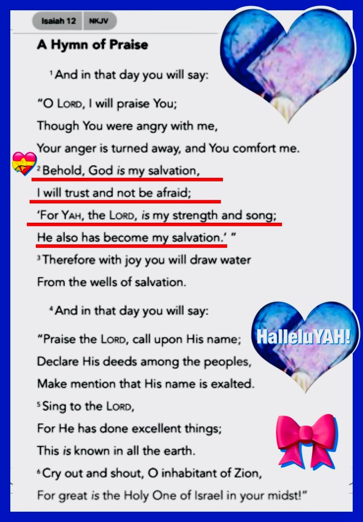 Isa 12:2 Behold, God is my salvation; I will trust, and not be afraid: for the LORD JEHOVAH is my strength and my song; he also is become my salvation.