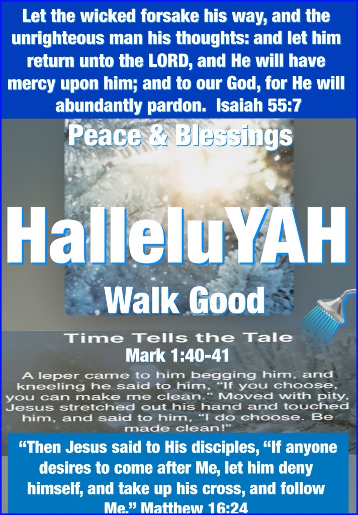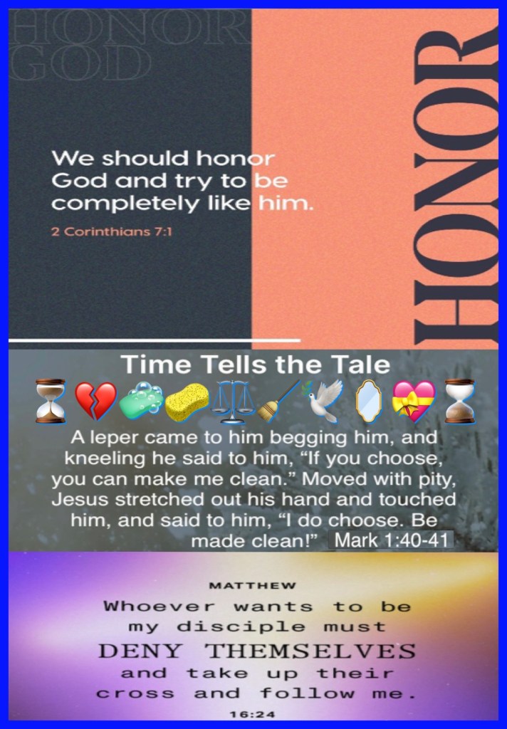 “Therefore,having these promises, beloved, let us cleanse ourselves from all filthiness of the flesh and spirit, perfecting holiness in the fear of God.” II Corinthians 7:1 “Now a leper came to Him, imploring Him, kneeling down to Him and saying to Him, “If You are willing, You can make me clean.” Then Jesus, moved with compassion, stretched out His hand and touched him, and said to him, “I am willing; be cleansed.”” Mark 1:40-41 “Then Jesus said to His disciples, “If anyone desires to come after Me, let him deny himself, and take up his cross, and follow Me.” Matthew 16:24