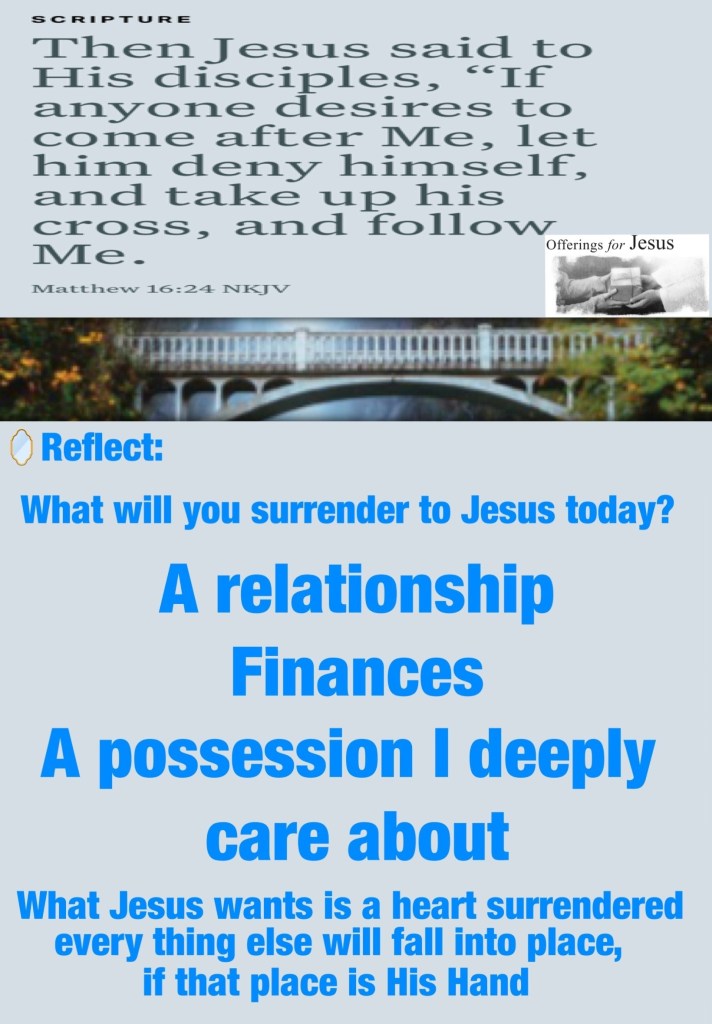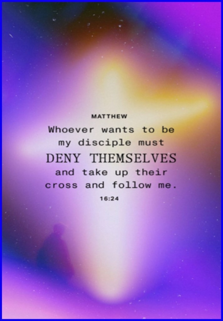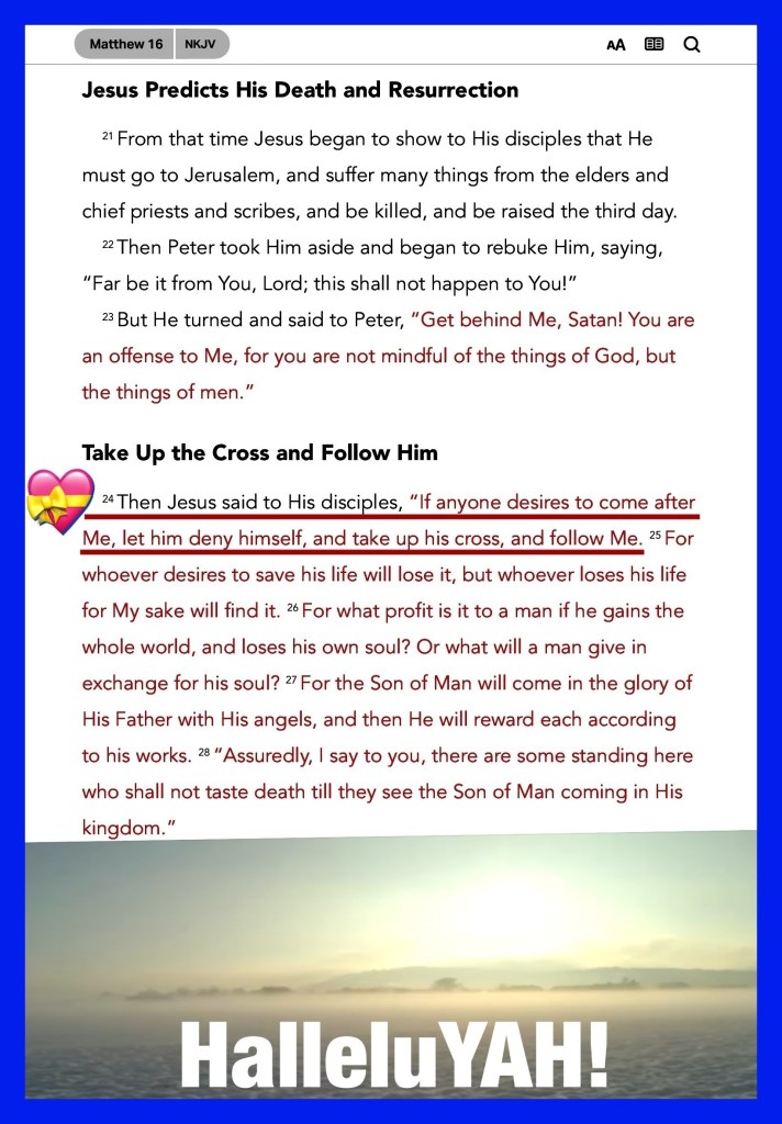 Mat 16:24 Then said Jesus unto his disciples, If any man will come after me, let him deny himself, and take up his cross, and follow me.