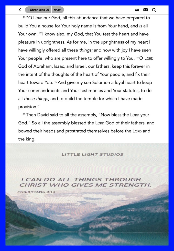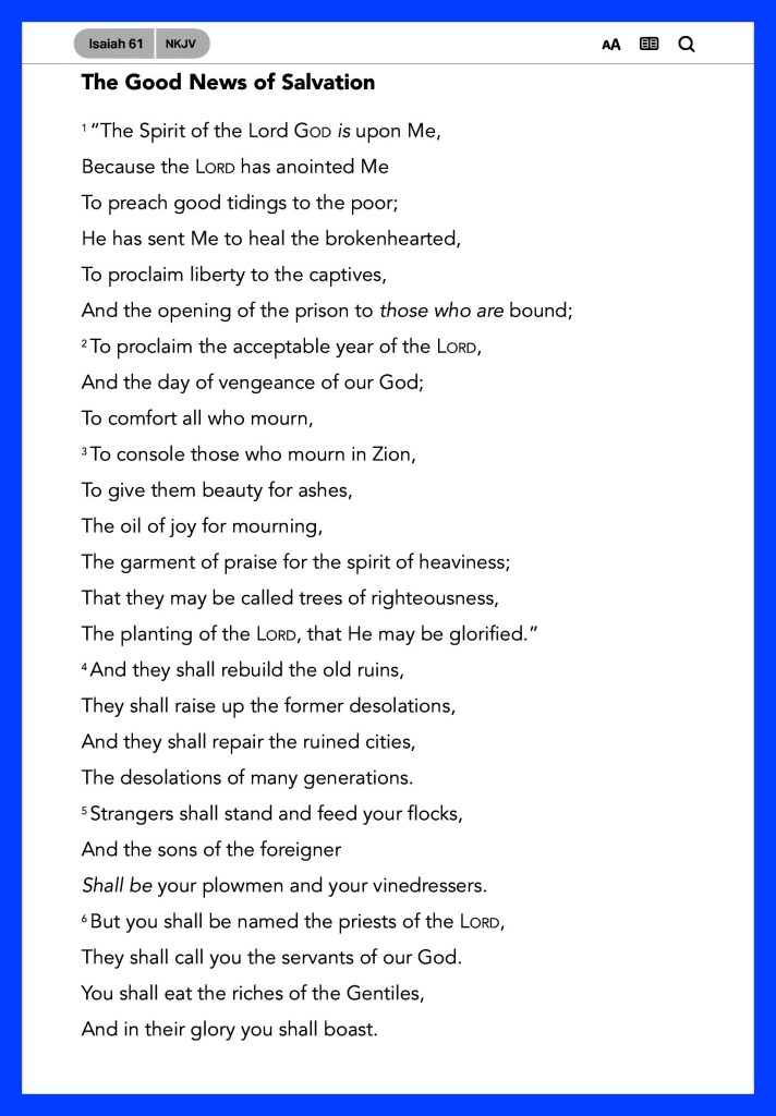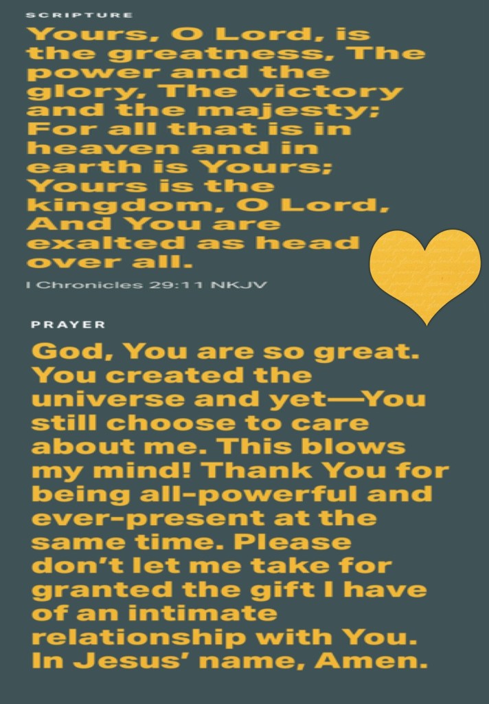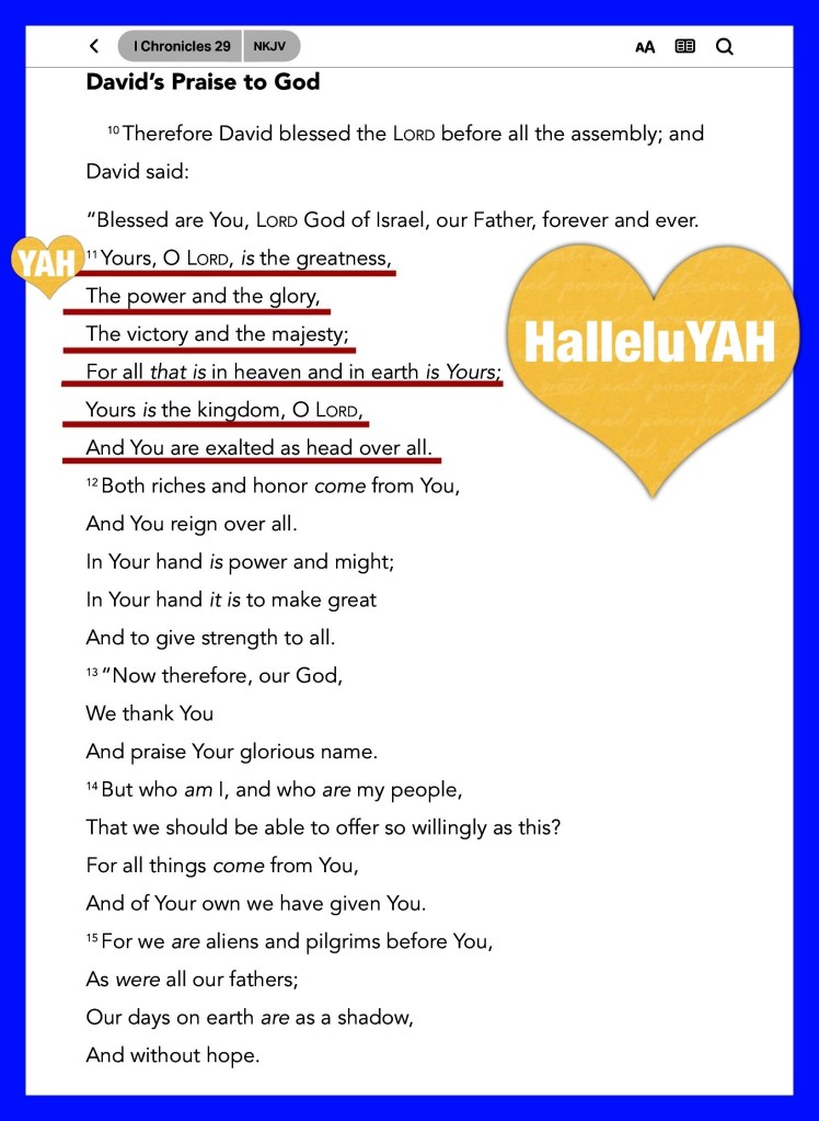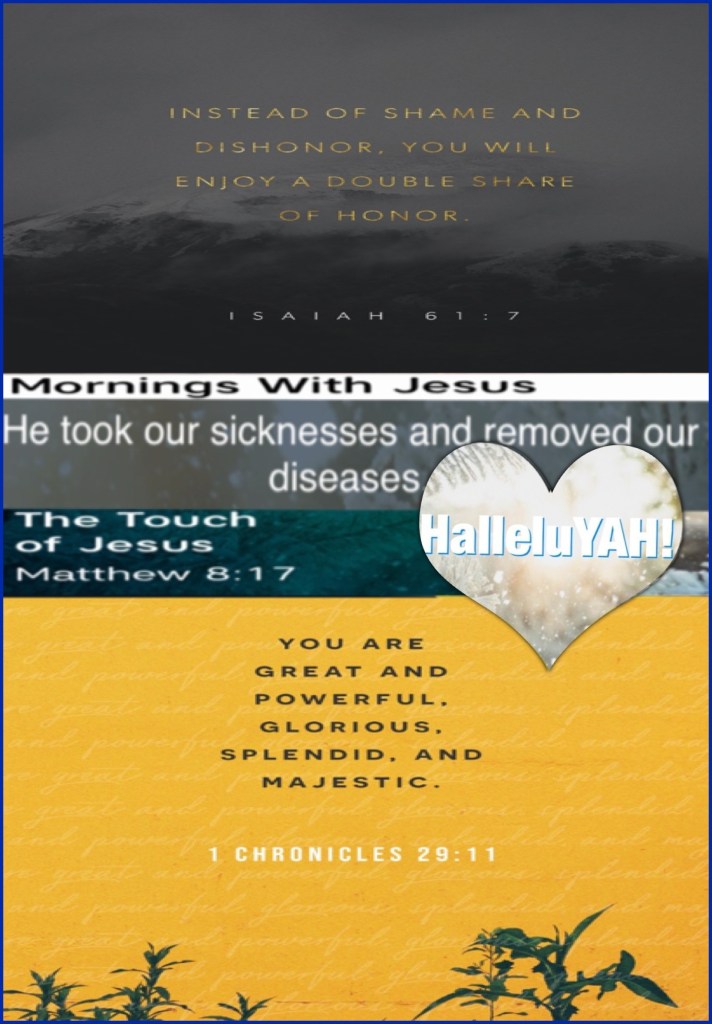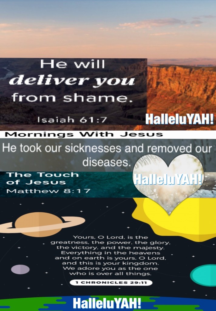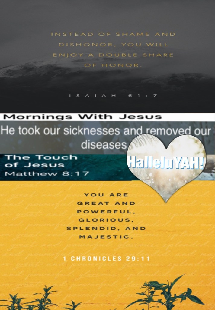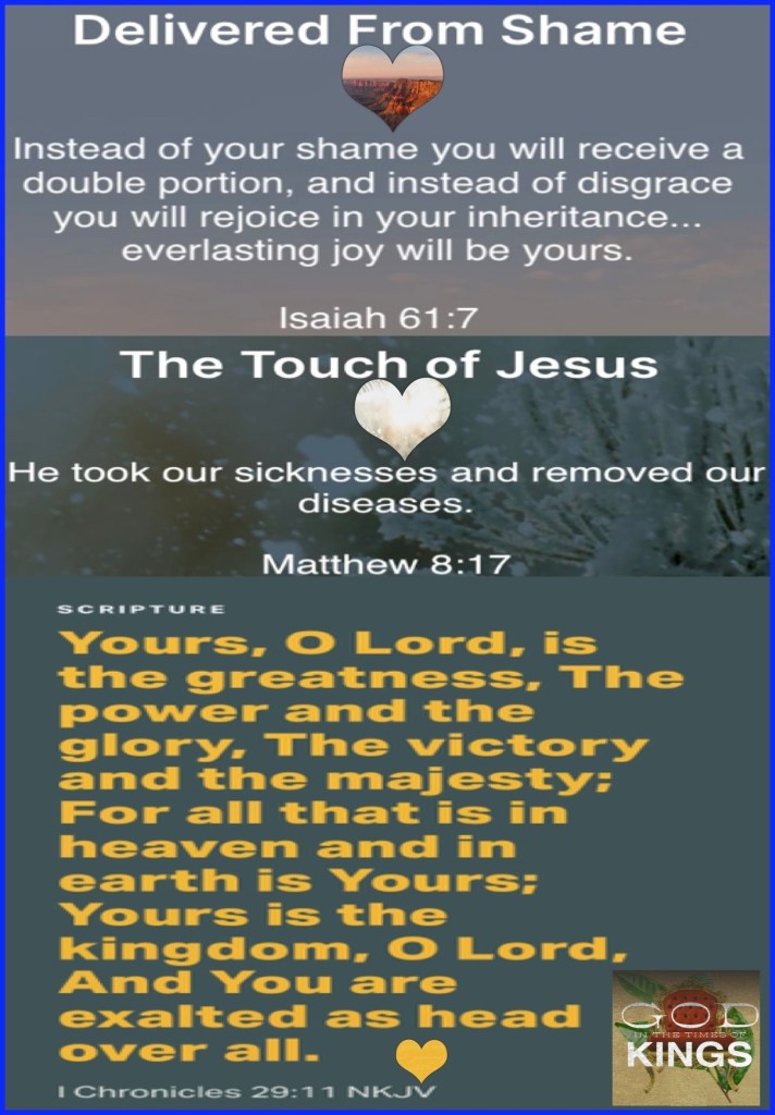 “Instead of your shame you shall have double honor, And instead of confusion they shall rejoice in their portion. Therefore in their land they shall possess double; Everlasting joy shall be theirs.” Isaiah 61:7 “that it might be fulfilled which was spoken by Isaiah the prophet, saying: “He Himself took our infirmities And bore our sicknesses.”” Matthew 8:17 “Yours, O Lord, is the greatness, The power and the glory, The victory and the majesty; For all that is in heaven and in earth is Yours; Yours is the kingdom, O Lord, And You are exalted as head over all.” I Chronicles 29:11